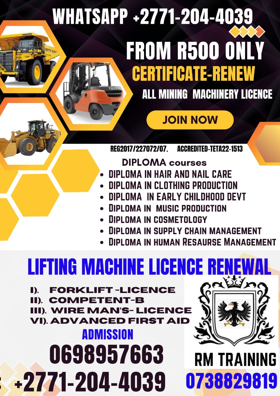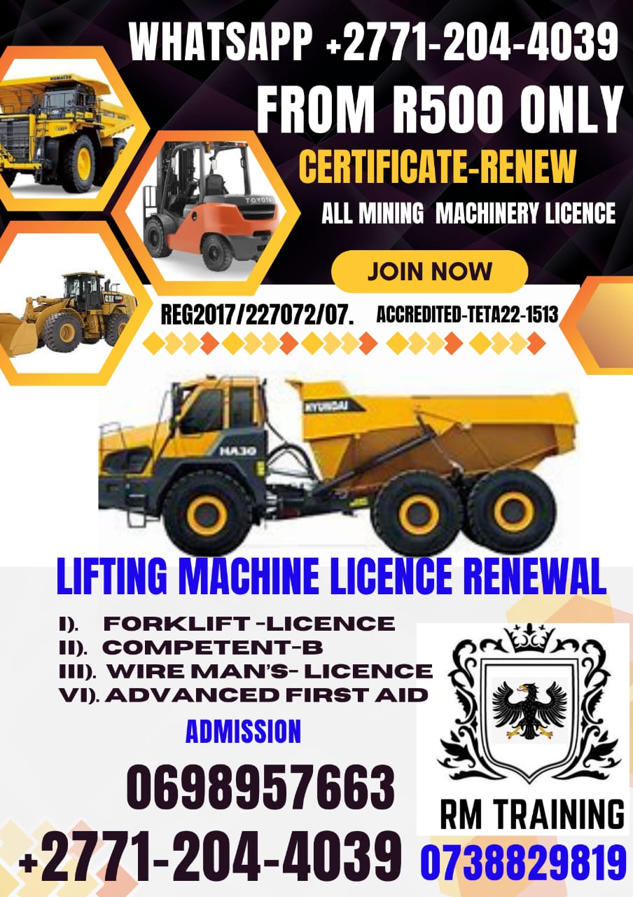 We are the best lifting machinery training provider. Try us today for a lovely quoteCity and Suburb - Polokwane, Polokwane