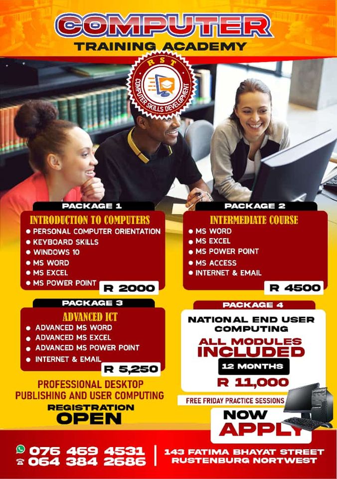 Come and register for computer studies at RST computer skills development RUSTENBURG TOWN 143 FATIMA BYATH STREET