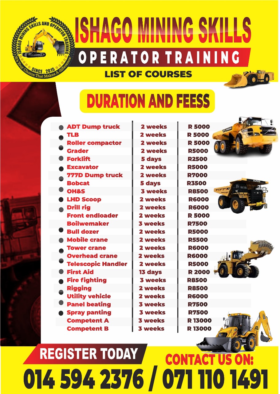 first aid level 1, 2 & 3 R3500, On-setter R12500, diesel mechanic R9000,
