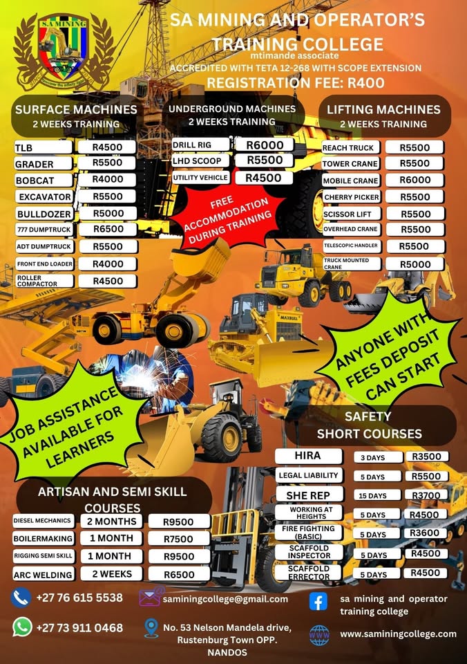 MACHINE OPERATION AT SA MINING COLLEGE IN RUSTENBURG, NORTH WEST +27766155538view more / +27739110468view more We are fully equipment and Accredited to offer mining and earthmoving machinery Operators . We train both theory and practicals. We are accredited with Teta, Ceta and Merseta we will show our accreditation before registration . -T.L.B R4500 2 weeks Training -Front end Loader R4000 2 weeks Training -Bull dozer R5500 2 weeks Training -Bob cat R4500 2 weeks Training -Grader R5500 2 weeks Training -Excavator R5500 2 weeks Training -Utility vehicle R4500 2 weeks Forklift R2300 5days Training -Reach truck R5500 5 days Training -L.H.D scoop R5500 2 weeks ower crane R5500 2 weeks Training -Mobile crane R6000 2 weeks Training -Climbing tower R5500 2 weeks Training -Overhead crane R5500 2 weeks Training -Truck mounted crane R5500 2 weeks Training -Dump truck 777 R6500 2 weeks Training -Dump truck Adt R5500 2 weeks Training -Underground dumper R 5500 2 weeks Training -Dump truck without restrictions R6500 2wks -Drill rig tam rock R6000 2 week Training -Drill rig bolt R7500 2 weeks Contact us on: Cell: [0766155538view more(tel:0766155538view more)/ [0739110468view more(tel:0739110468view more) Email address: saminingcollege@gmail.comview email... address: 53 Nelson Mandela drive, opposite Nando's Rustenburg