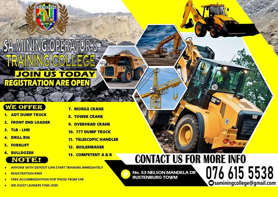 #Specials Combo Skills Training Designed by experts in industry with live instructor-led classes and Onsite hands-on Practical. Train 2-3 Machines for 20% Discount Mining Machines, Semi-Skilled Artisan & Safety Courses Head Office: SA MINING AND OPERATOR TRAINING COLLEGE 53 corner Nelson Mandela drive and kerk street opposite Nando's,North West South Africa Office: WhatsApp: Branch: 53 corner Nelson Mandela drive and kerk street opposite Nando's Rustenburg CBD, North West Office: ☑ Fully Registered & Accredited ☑ Gain Access to Mines ☑ Earn a decent Income ☑ Online Classes ☑ Long distance Classes ☑ Part-time Classes Available ☑ No formal Qualifications Needed ☑ No driver’s license needed ☑ Free Accommodation ☑ We fetch you upon your arrival in Rustenburg CBD ☑ Don’t regret! Beware of the schools which are not Registered and Accredited. Machines: #Dump Truck-ADT 2 Weeks Training=R5000 #Rigid Dump Truck 777 2 Weeks Training =R6500 #Excavator 2 Weeks Training =R5000 #Front End Loader 2 Weeks Training =R4000 #Backhoe-TLB 2 Weeks Training =R4500 #Grader 2 Weeks Training =R5500 #Mobile Crane 2 Weeks Training =R6000 #Truck Mounted Crane 2 Weeks Training =R5500 #Telescopic Handler 2 Weeks Training =R5000 # Drill rig-Tamrock 2 Weeks Training =R5500 #LHD Scoop 2 Weeks Training =R4500 #Bobcat Skid steer 2 Weeks Training =R4500 #Forklift 2 Weeks Training =R2300 #Superlink Truck 2 Weeks Training =R11500 #Rigging Basic 1 Weeks Training =R3500 #BoilerMaking 6 Weeks Training =R7500 #Welding 6 Weeks Training =R6500 #Occupational Health & Safety-OHS 6 Weeks Training =R8500