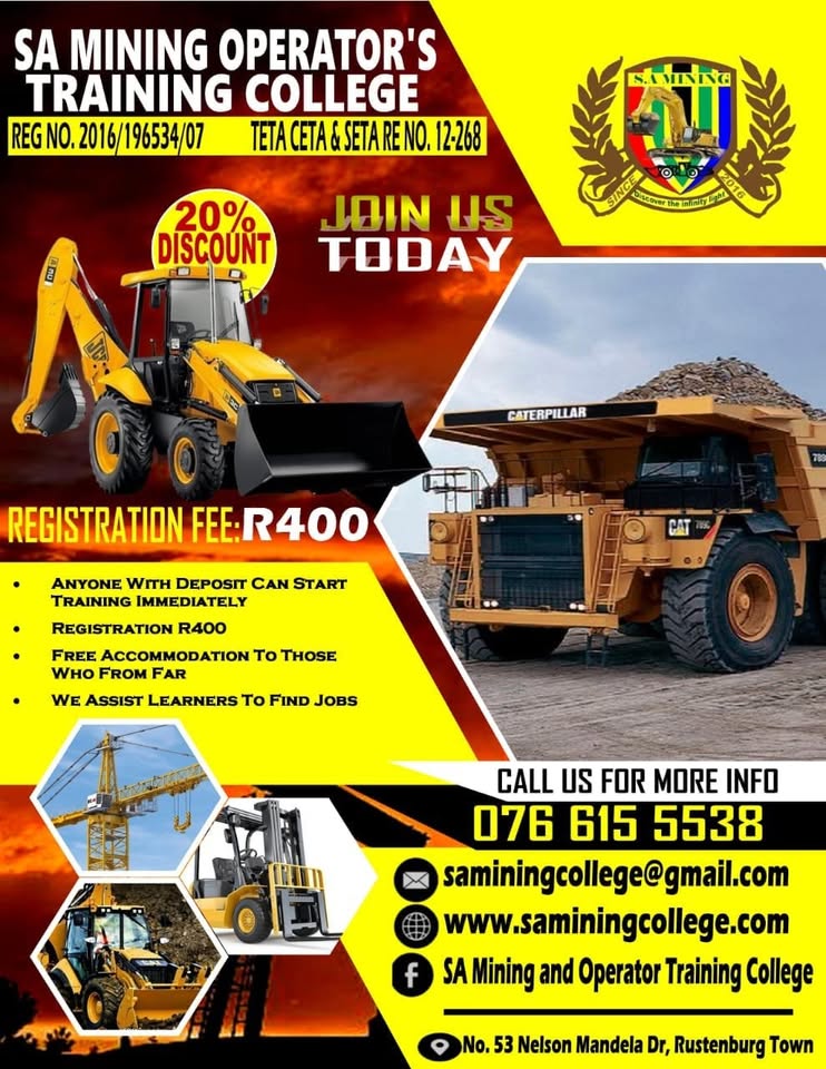 TRACTOR LOADER BACKHOE [ TLB TRAINING COURSE IN SOUTH AFRICA 0766155538view more / 0739110468view more TLB is an abbreviation for "tractor loader backhoe" a type of heavy equipment vehicle used in construction and other fields. It's a compact and versatile machine with a front loader and rear backhoe attachment, making it suitable for digging, loading, and various earthmoving tasks. Here's a more detailed breakdown: Tractor Loader Backhoe: The TLB is essentially a modified tractor with a front loader bucket and a backhoe attachment. Versatility: It can be used for a wide range of tasks, including digging trenches, moving dirt, breaking asphalt, and transporting materials. Applications: TLBs are common in construction, farming, and landscaping, often used for tasks like road building, excavation, and earthwork. Compact Size: Compared to larger excavators, TLBs are considered compact, allowing them to maneuver in tighter spaces and potentially cause less structural damage. Training: TLB operation requires specific training, and there are many courses available to teach individuals how to operate these machines and at SA MINING AND OPERATOR'S TRAINING COLLEGE we do train individuals how to operate this machine. Course duration is 2 WEEKS Training is done theoretically and practically. For more information contact us on: calls: 0766155538view more / whatsapp: 0739110468view more You can also email us on: info@saminingcollege.comview email... / saminingcollege@gmail.comview email...