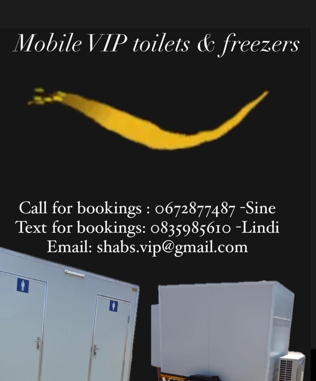 Mobile flushing VIP toilets with basin and mirror inside both male and female toilets. We also have Mobile Fridge /freezer with shelves and hangers (temperature adjustable ). Call or text for more pictures & details.