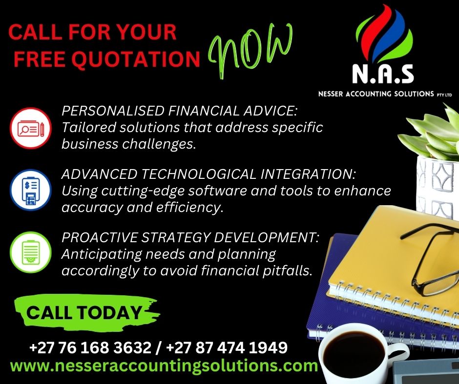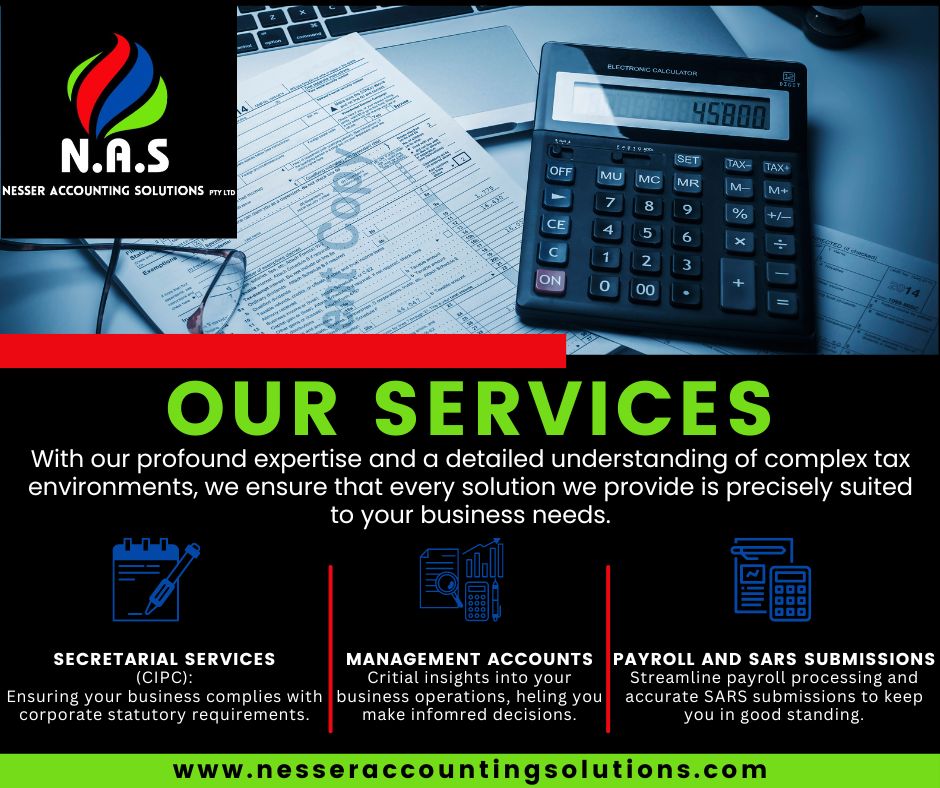 and accurate results. Welcome to Nesser Accounting Solutions, your premier partner in financial expertise. As one of the leading accounting firms in Gauteng, we pride ourselves on delivering exceptional service tailored to each client’s unique needs. Our commitment extends beyond mere numbers; we strive to provide insightful solutions that enhance your business operations and financial strategies. We offer a comprehensive suite of services designed to cater to all aspects of your financial needs—from financial accounting and tax consultancy to management accounting. Each service is crafted to help businesses streamline their financial operations, ensure compliance with current regulations, and optimise their financial health. In addition, we provide all CIPC company registrations, shareholder, director, member, and detail changes. We also handle beneficial ownership changes and prepare Annual Financial Statements on request. We invite you to delve deeper into the range of services and solutions offered at Nesser Accounting Solutions. Whether you are looking to refine your financial strategy, ensure meticulous compliance, or seek proactive financial advice.