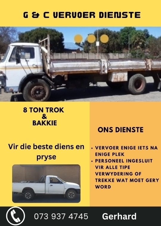 For all your transport needs (bakkie & trailor, 3 ton truck, open 8 ton truck, closed 8 ton truck.