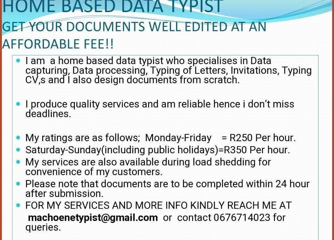We are small outsourced admin based company who offers administrative services at a very reasonable rate per hour. We are available 24 hours a day for all your admin needs. If you have any interest in the above, please let us know at (Machoenetypist@gmail.comview email...) so we can start being of service.