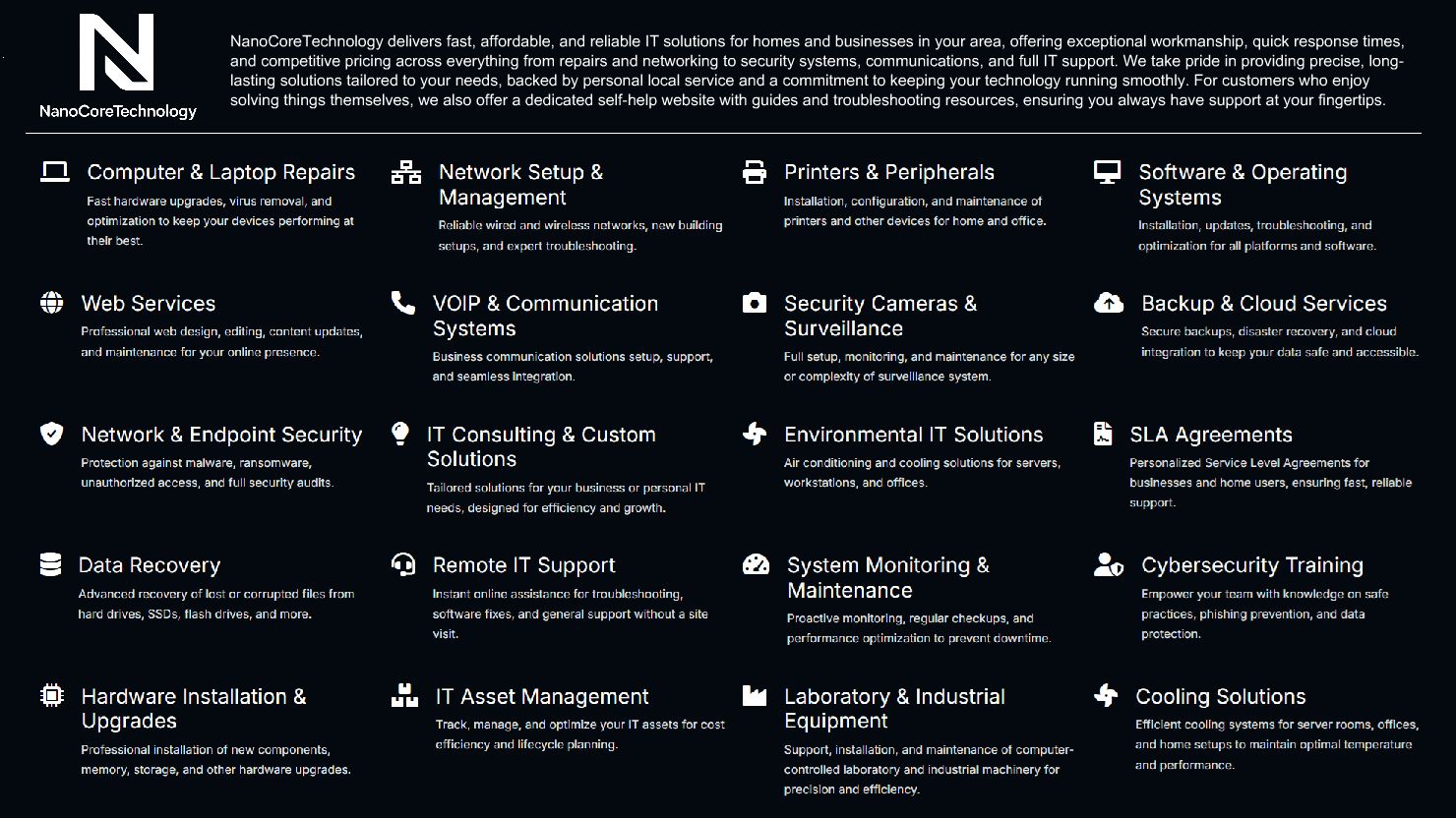NanoCoreTechnology provides expert, friendly, and professional service for homes and businesses, including self-help guidance for those who prefer doing it themselves.