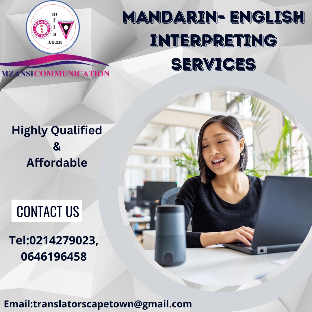We offer high-quality and professional Mandarin-to-English interpreting services in South Africa; we provide Mandarin interpreter services for medical centers, hospitals, health centers, Court Rooms, Conferences, meetings, marketing events, and more. We provide the most accurate, simultaneous, and consecutive interpreting with all necessary equipment’s. Contact us now for a free quote. Email translatorscapetown@gmail.comview email... Tel 0214279023view more, 0646196458view more https://www.mfla.co.za/interpreters/
