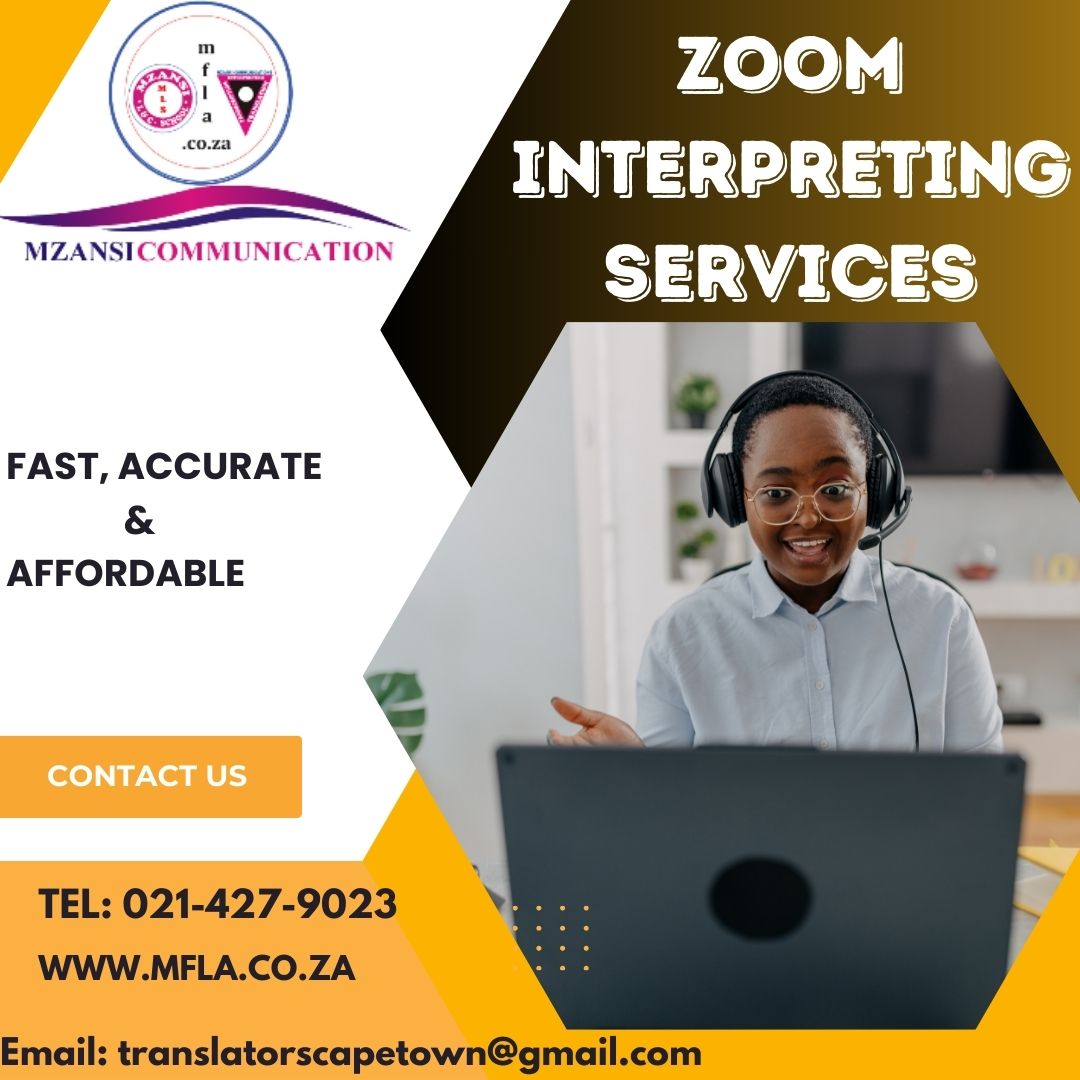 Break language barriers and connect seamlessly with our Zoom interpreting services. Our skilled interpreters facilitate clear communication in real-time, ensuring all participants understand and contribute effectively. Whether its business meetings, webinars, or international conferences, trust us to provide professional interpretation services tailored to your needs. Enhance your Zoom experience with our reliable interpreting solutions today! For a free quote send an email: translatorscapetown@gmail.comview email... Tel: 0214279023view more, 0646196458view more https://www.mfla.co.za/interpreters