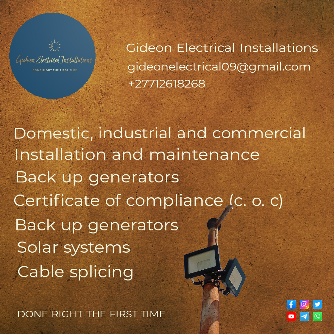 Domkestic industrial and commercial installations and maintenance, coc, back up generators, solar systems,3 phase ,lights,chanderliers
