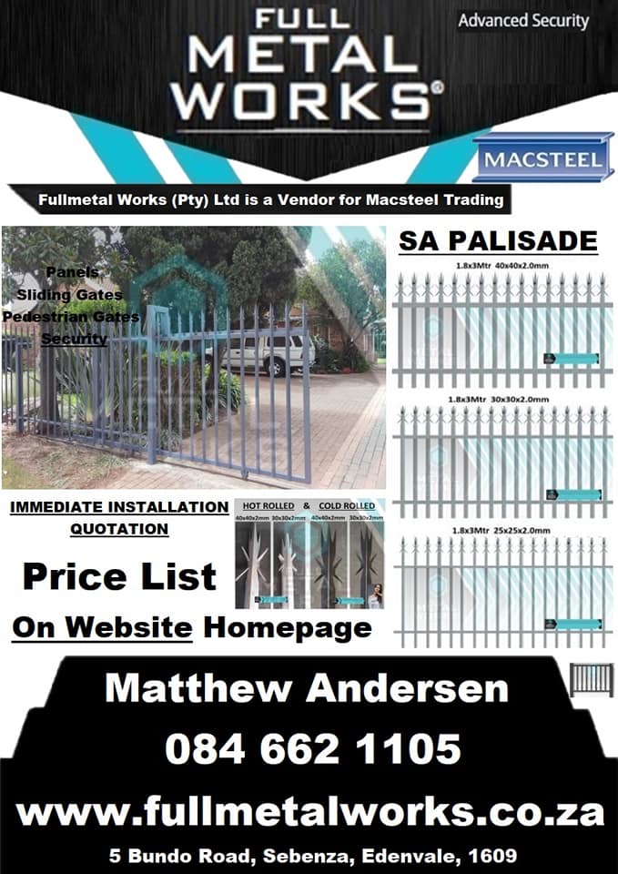 Supplier and lnstallation, SA best prices, Sales@fullmetalworks.co.zaview email... 0846621105view more