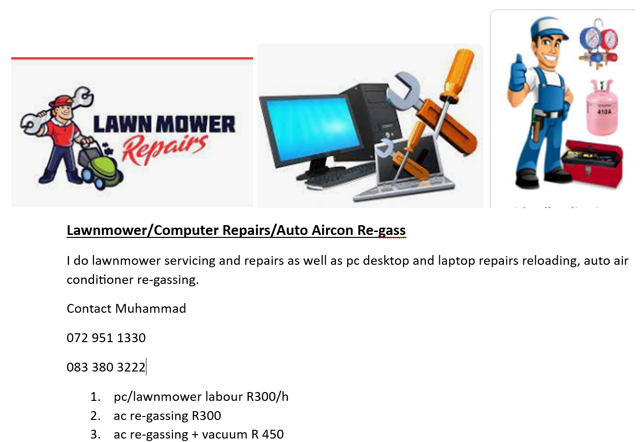 I do lawnmower servicing and repairs as well as pc desktop and laptop repairs reloading, auto air conditioner regassing.