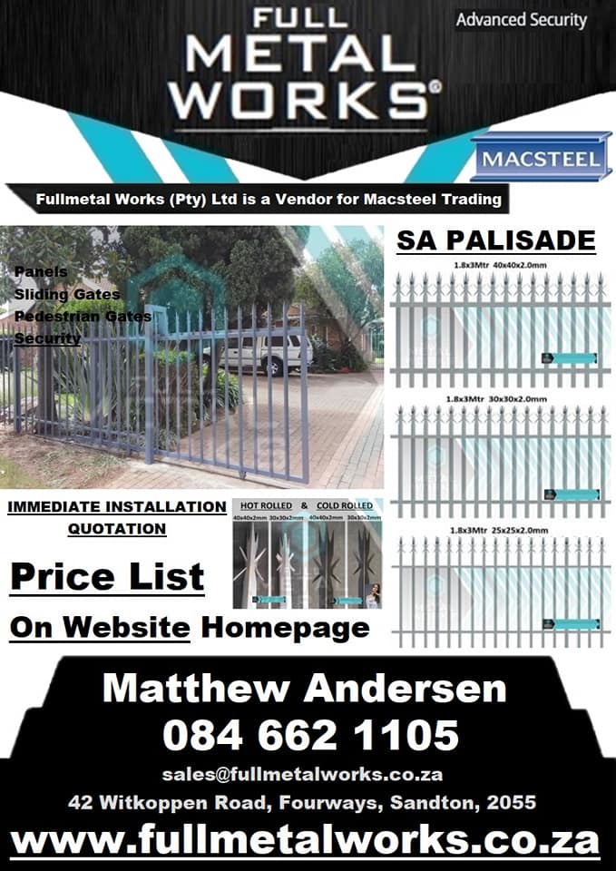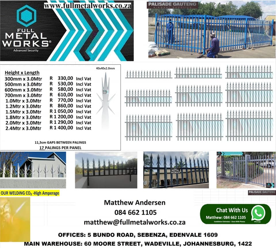 Spikes Sliding gates Roller gates Burglar bars Supplier and installation, sales@fullmetalworks.co.zaview email... 0846621105view more