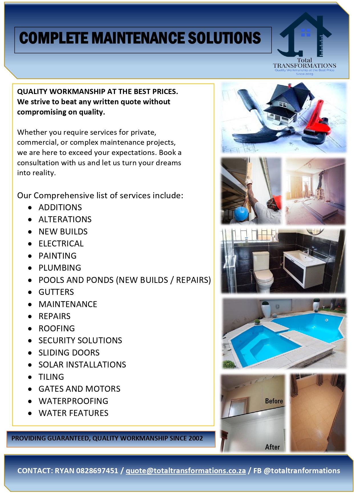 Complete solutions for Residentials, Commercial and Complexes. Serving our valuable clients since 2003. We strive to beat any written quote. Providing the best quality and workmanship. We offer all services from additions, alterations, plumbing, painting, handyman services, pool maintenance, new pool and pond builds, electrical, tilling and everything in between.