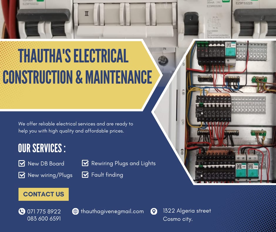 Thautha's Electrical, Construction and maintenance: include installations, repairs, and maintenance of electrical systems, while construction services may involve building, renovating, or remodelling structures.