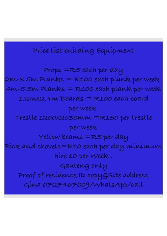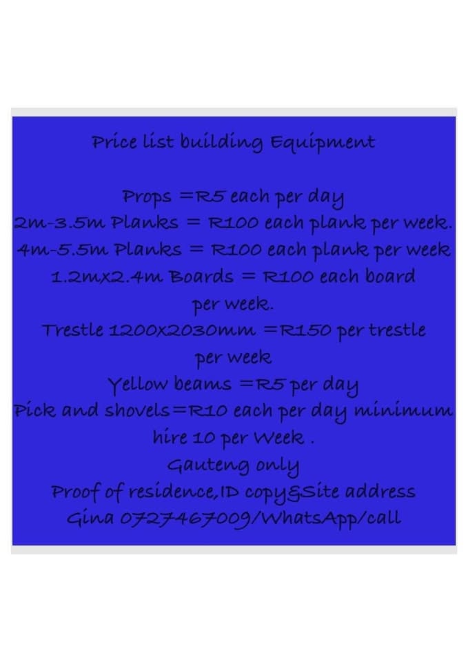 Building Props and Scaffolding for hire . We require site address; ID copy Proof of residence Delivery at Nominal fee within Gauteng only Call /inbox/Whatsapp