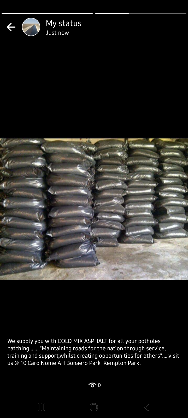 Road tar surfaces ,Driveways maintenance ,potholes patching, Cold mix. More details:
