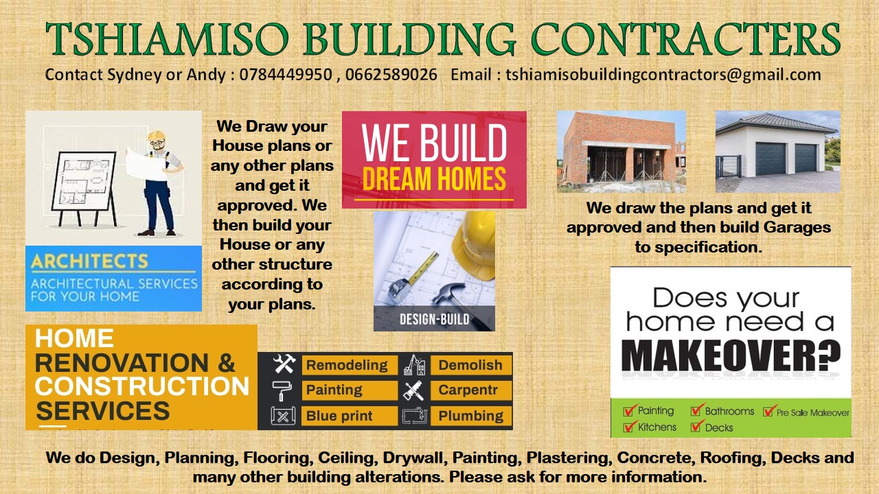 We do Design, Planning, Flooring, Ceiling, Drywall, Painting, Plastering, Concrete, Roofing, Decks and many other building alterations. Please ask for more information.