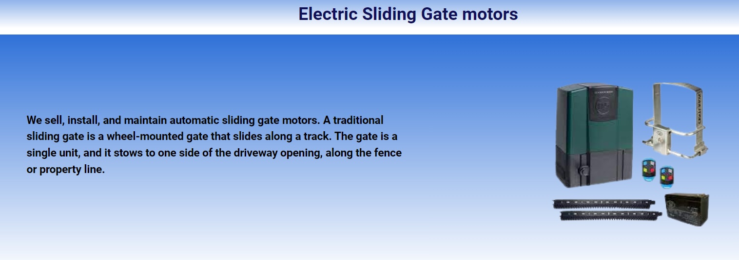 We sell, install, and maintain automatic sliding gate motors. A traditional sliding gate is a wheel-mounted gate that slides along a track. The gate is a single unit, and it stows to one side of the driveway opening, along the fence or property line.