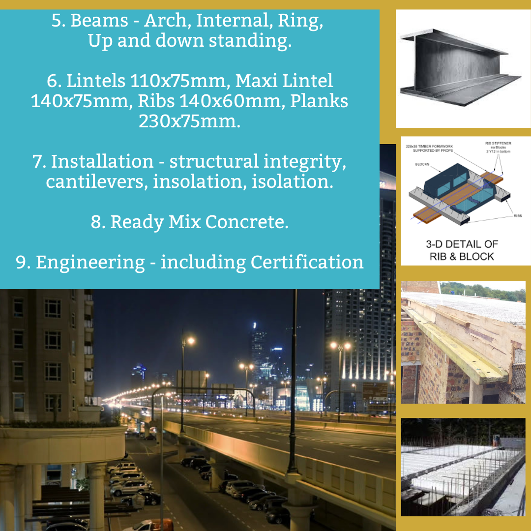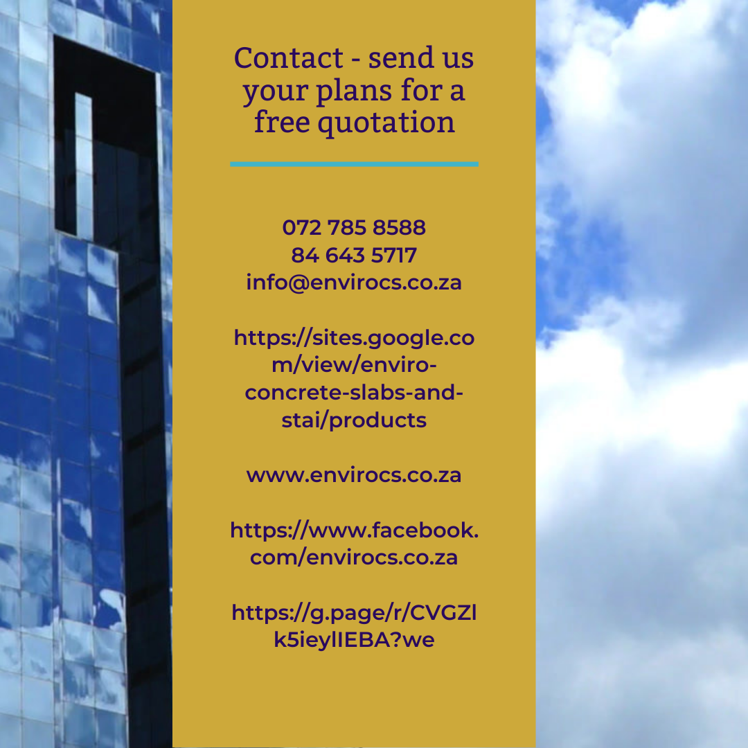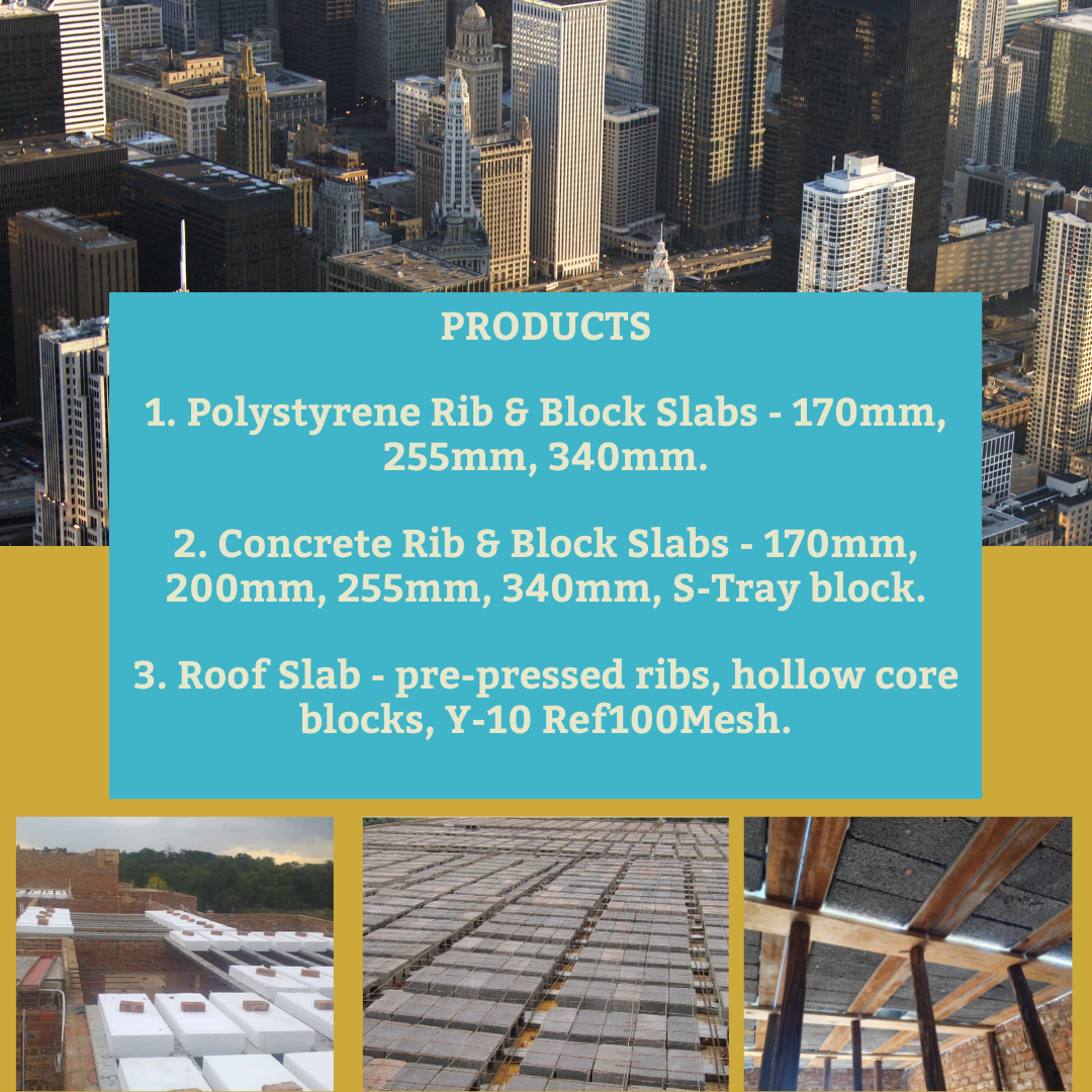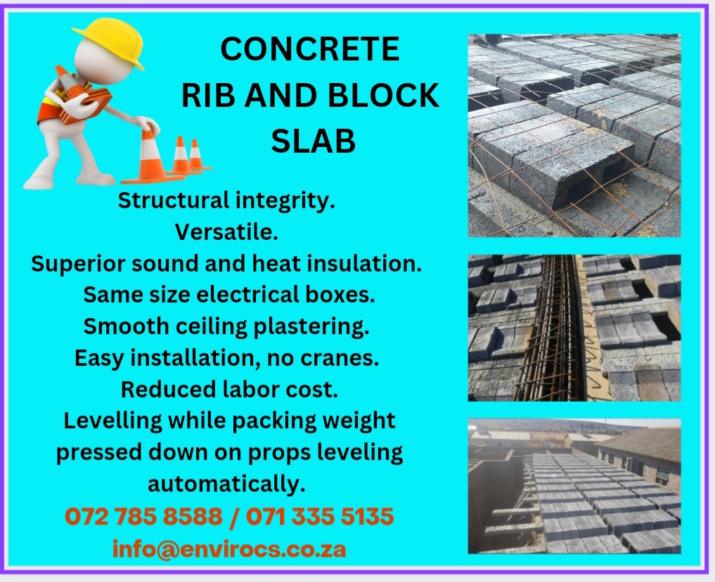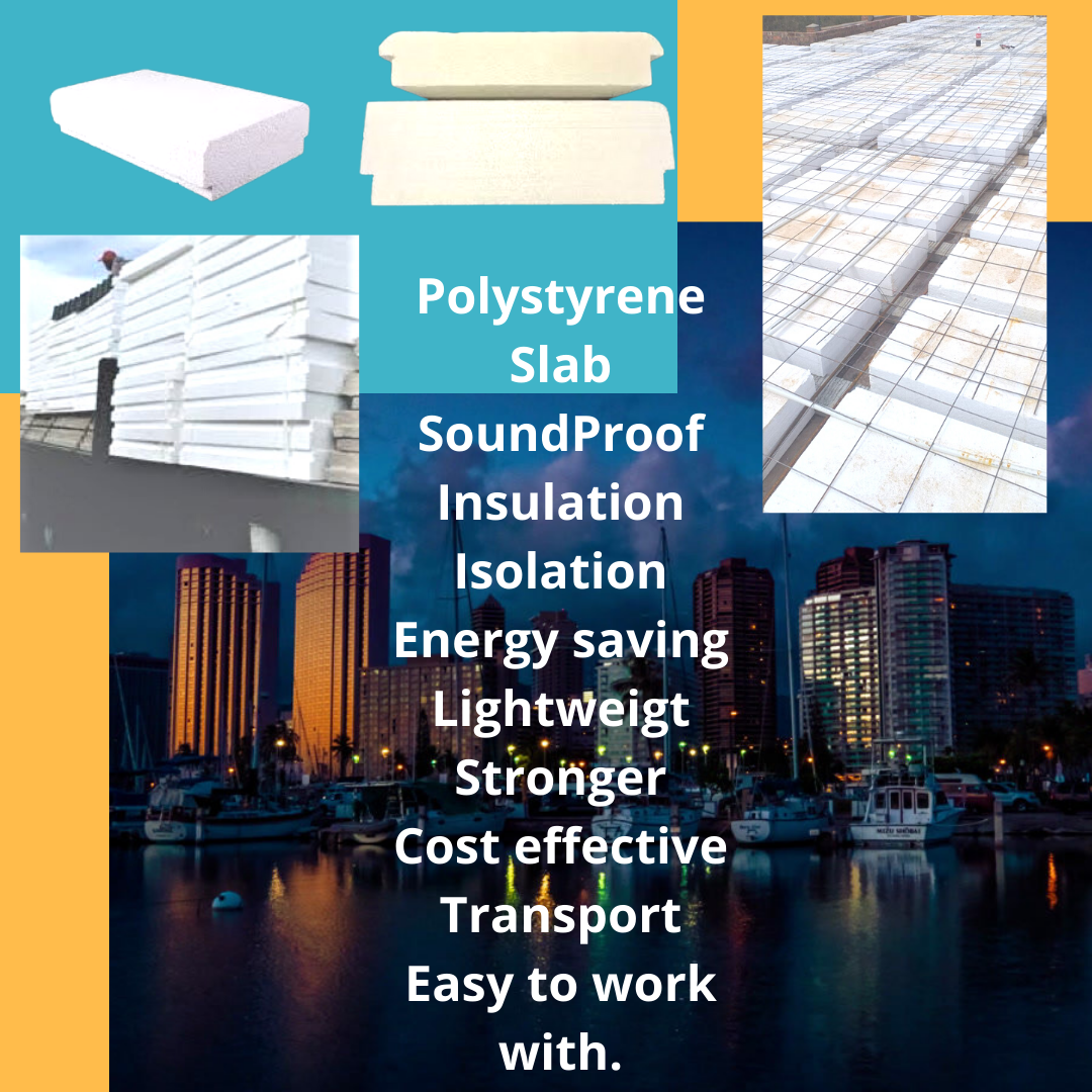 1. 90% Lighter than concrete rib & block 2 system. Only 41kg product weight per m2 compared to 165kg/m2. 2. One polystyrene block needed to cover 1m2 & weighs only 4.5kg, compared to concrete blocks weighing 125kg. 3. Cheaper transport cost due to weight. Up to 200m2 on 1 x 8 ton truck. 4. SANS 204 energy efficiency compliance. R - value of 5.8 compared to 1.8 of concrete rib & block system. 5. Superior sound properbilities. makes the slab installed totally sound proof. 6. Totally carbon foot print free. Fire retardant material. 7. The polystyrene block acts as an insulation layer. No addition insulation required. 8. Green product - endorsed by government for energy efficient building.