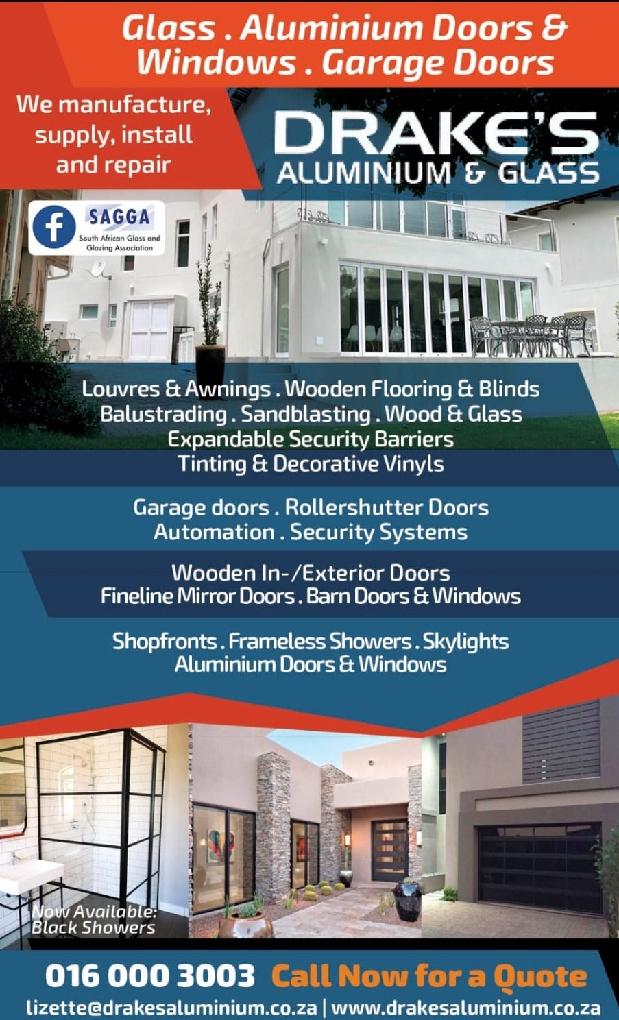 Come and visit our factory at 49 Japie Krige Street, Unitaspark AH, or give us a call 016 000 3003view more for a free quotation or site visit, send through plans for quotations to lizette@drakesaluminium.co.zaview email... or Visit our website www.drakesaluminium.co.za or our Facebook page https://www.facebook.com/www.drakesaluminium.co.za/