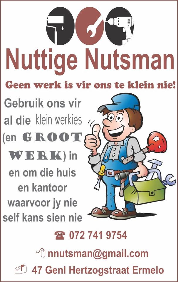 Nuttige Nutsman Herstel/ Instandhoudings Kontak ons vir n gratis kwotasie binne Ermelo *Reiskoste geld vir enige kwotasies buite Ermelo* Kontak: 072 741 9754view more Epos: [hidden information]