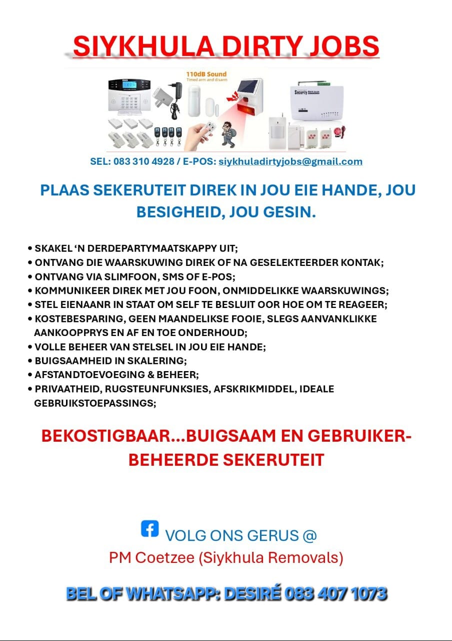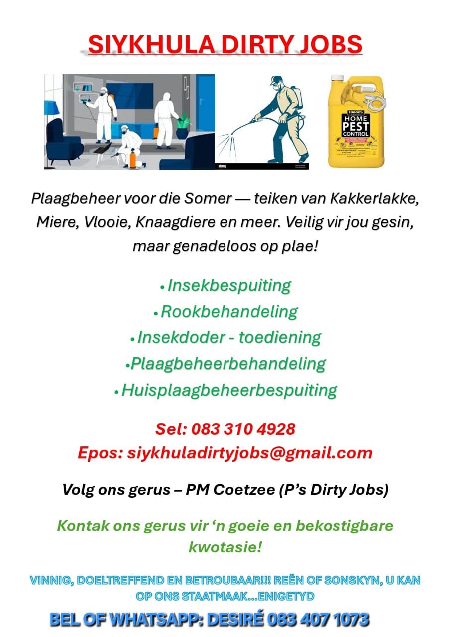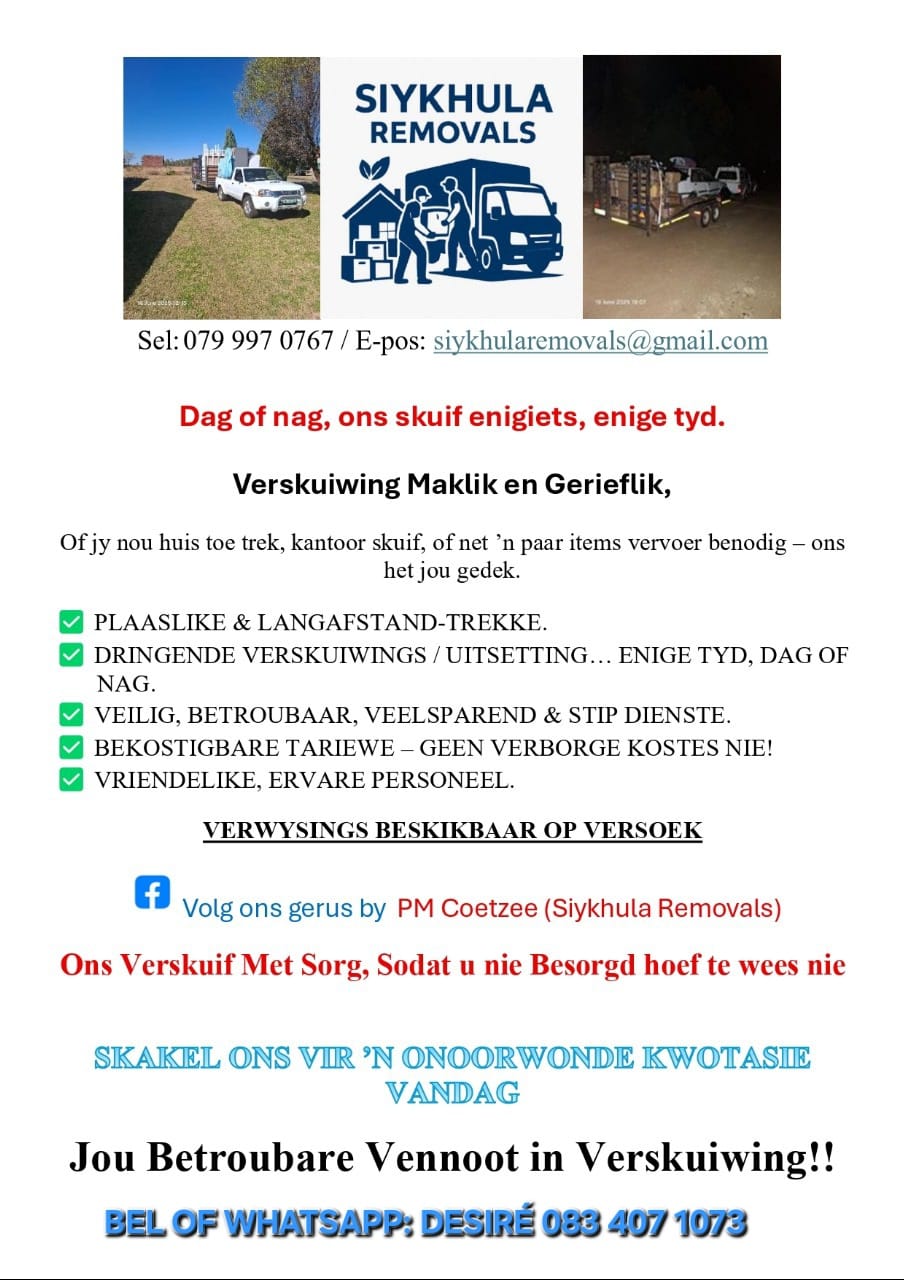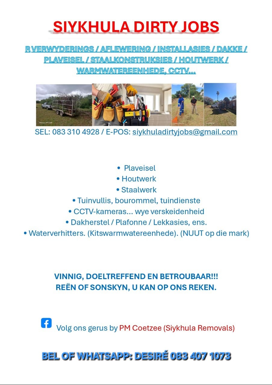 Is jy opsoek na n handyman en iemand om jou trekke te laat ry dan is jy op die regte plek kontak SIYKHULA DIRTY JOBS & REMOVALS nou ons doen iets van alles Desire: 083 407 1073view more