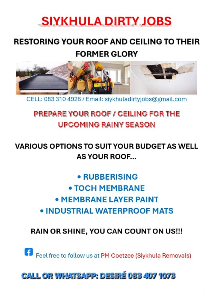 Are you looking for a handyman and someone to move your furniture then you are in the right place contact SIYKHULA DIRTY JOBS & REMOVALS now we do something of everything Desire: 083 407 1073view more