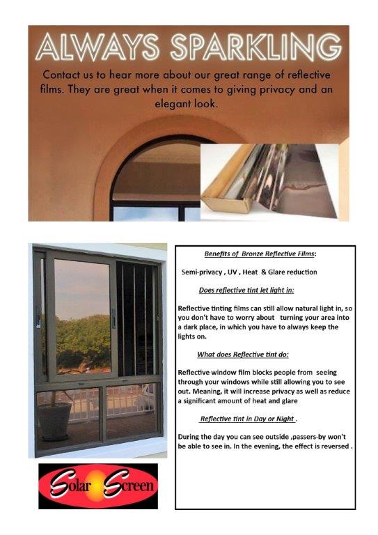 Bronze Reflective Window Tint - Smash and Grab Enhance Your Home with Solar Screen’s Bronze Reflective Tint Why Choose Bronze Reflective Tint? Daytime Privacy: The reflective surface ensures privacy during the day, keeping prying eyes at bay. Enhanced Appearance: The elegant bronze finish upgrades the look of your home, adding a touch of sophistication. Our Commitment to Quality: 5-Year Warranty: We stand behind our window tint and Smash and Grab films with a solid 5-year warranty. Supplier Support: Our products are fully supported by our suppliers, guaranteeing 100% satisfaction. Convenient Operating Hours: Monday to Friday: 08:00 AM - 05:00 PM Saturdays and Public Holidays: 08:00 AM - 02:00 PM Visit Our Branches: Table View Branch: Contact: BENJAMIN Phone: 084 895 6577view more / 021 556 1942view more ext. 1 Maitland Branch: Contact: DAVID Phone: 078 671 3029view more / 021 556 1942view more ext. 2 Uninterrupted Service: We remain fully operational, even during load shedding. For a free quote and to learn more about how our Bronze Reflective Tint can benefit you, call Solar Screen today! 🏡☀️