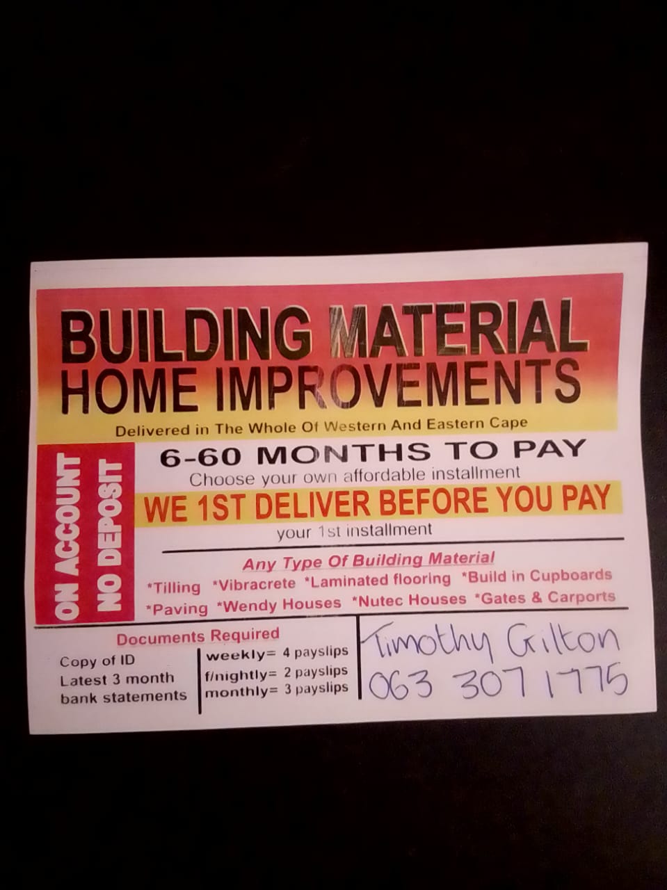 Hi my name is Timothy Gilton. I'm a Sales and Marketing rep for a company called Homedecore Warehouse in Parow. We sell Building Materials and do Home Improvements