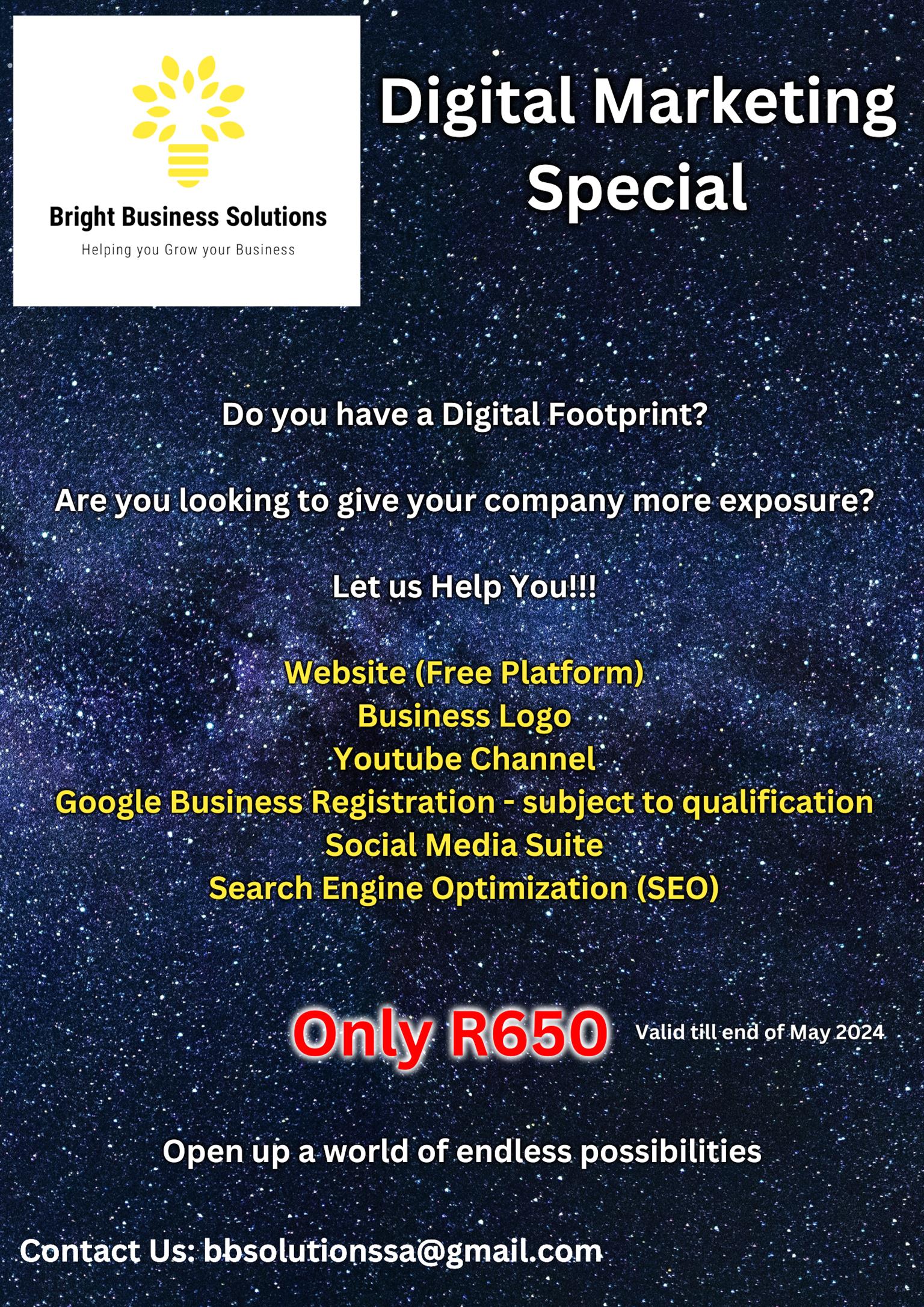 In a world where digital marketing and a digital presence is needed for businesses to grow, we have put together a package that is very affordable and helps you get your business noticed. our package uses free platforms which minimizes the cost and is professionally created.