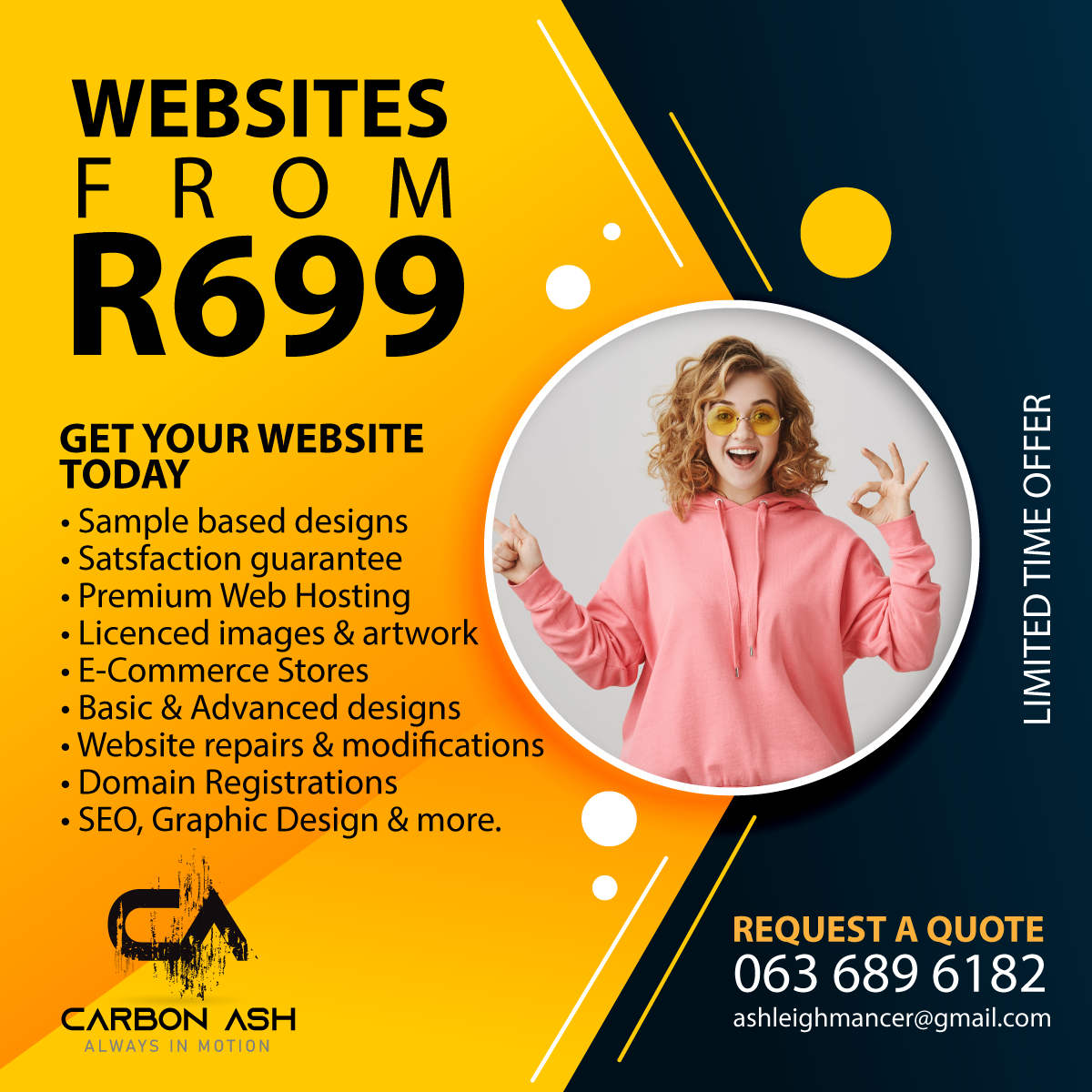 Why pay expensive amounts for web design? April Special for a basic 3 page website for R699 once off (Excluding domain registration & hosting). Same day service. Get in touch with me today. I'm an SEO Master (rank you on google), graphic designer, web master & video editor.