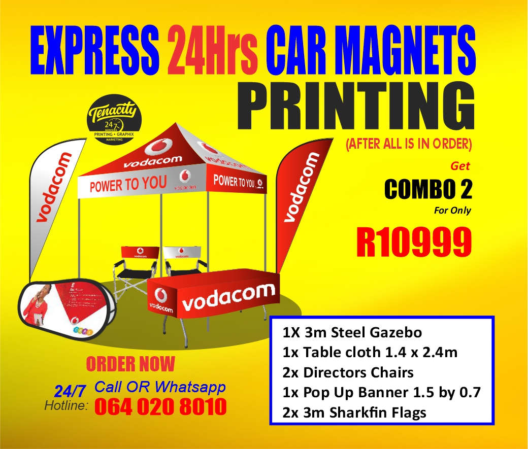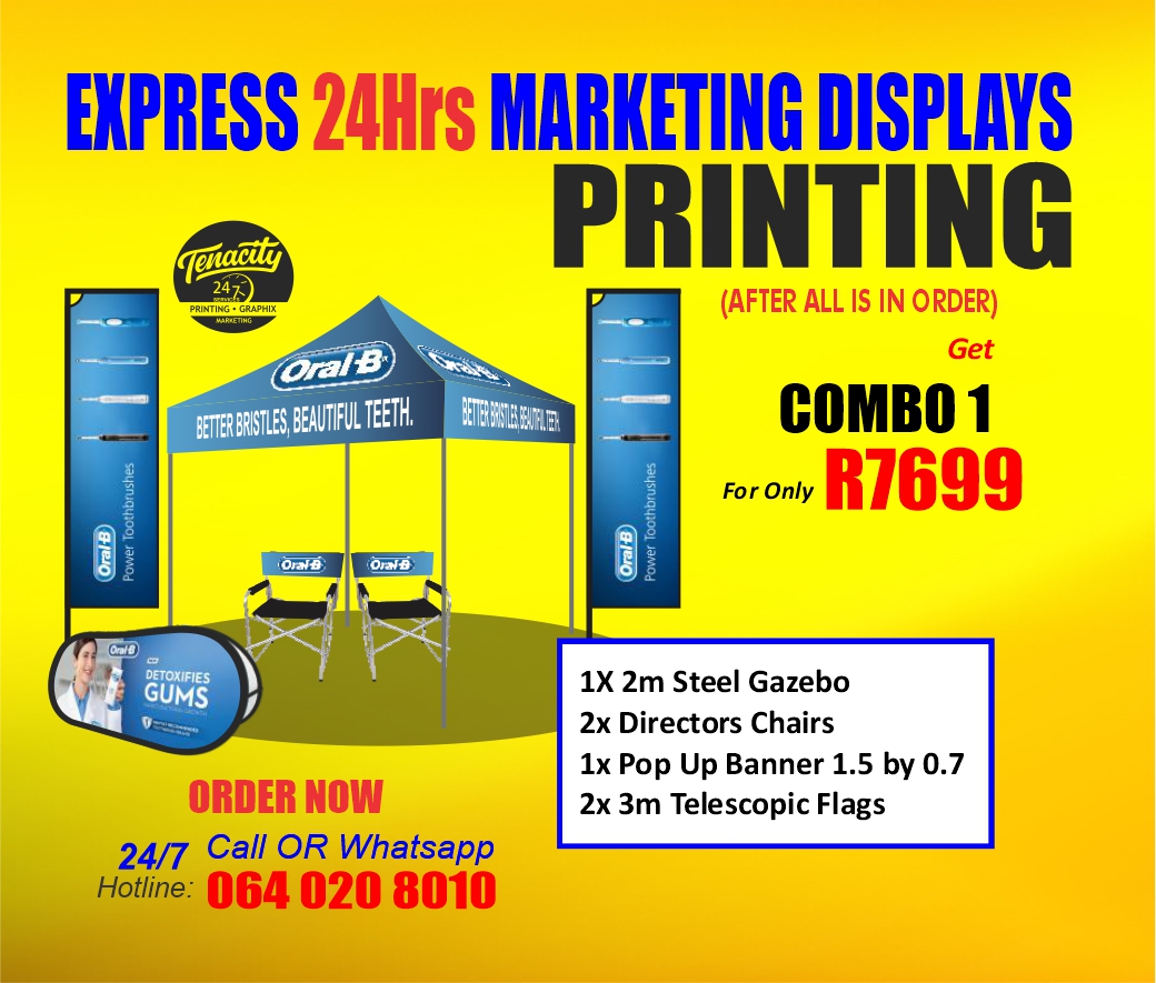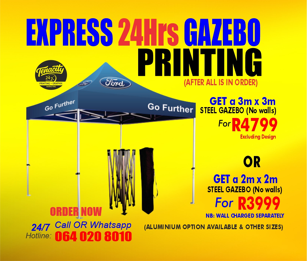 Get a 3m by 3m Steel Custom printed Gazebo. Add any design or details. Advertise as a pro. We also print wall banners, pull ups, xbanners, uniforms, tshirts, flags, promotional items. Call or whatsapp 0640208010view more