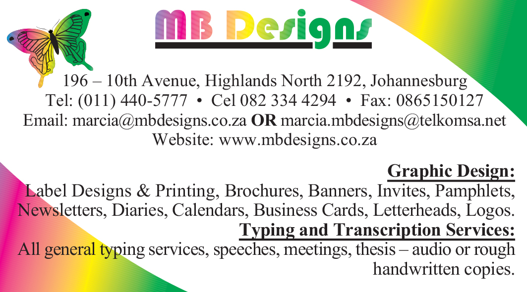 I offer is a one-stop graphic design service to ANY sized company. We have experience in brochures, banners, invites, pamphlets, newsletters, diaries, calendars, business cards, letterheads, logos. Not only do I offer the design service, but because of my years in printing, I can source the most cost effective and quality printing for you. I also offer transcription and typing services either in audio or hand written rough copies