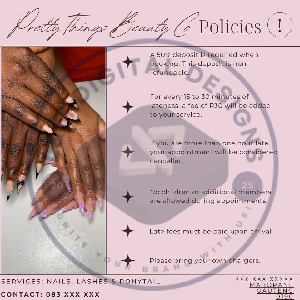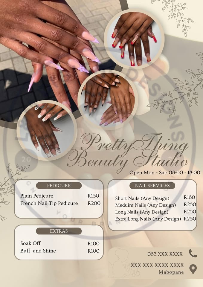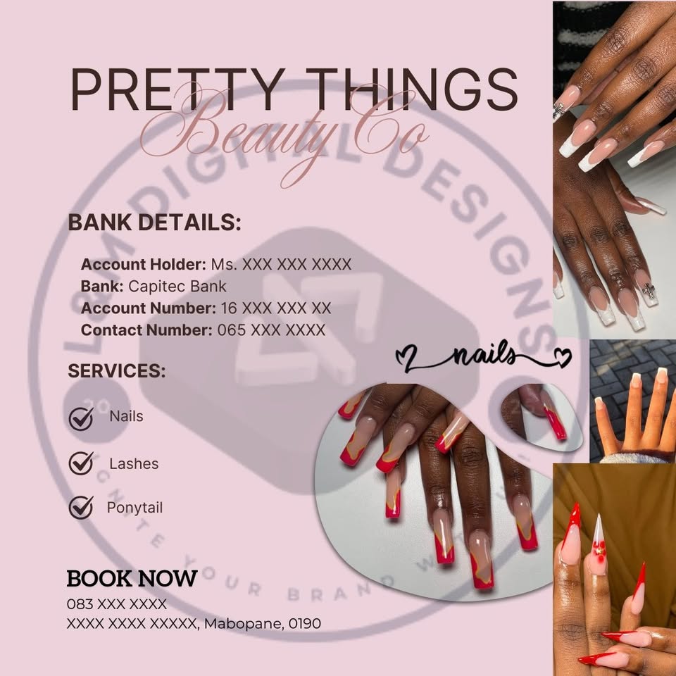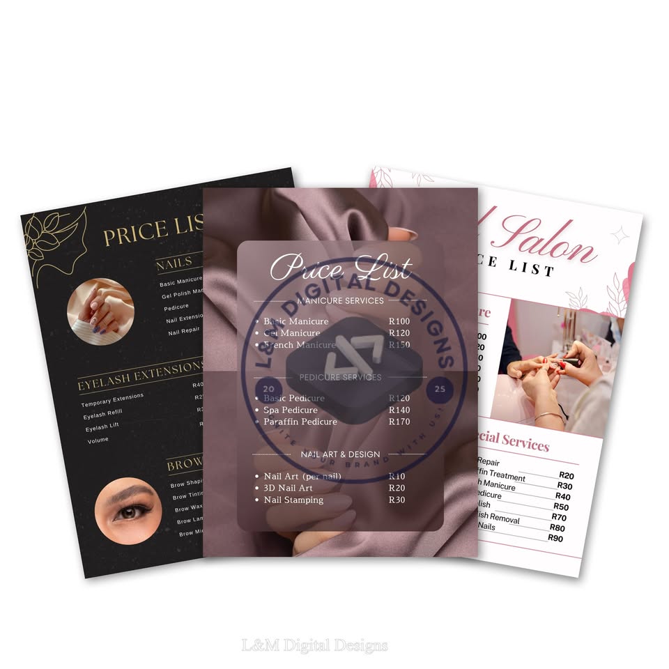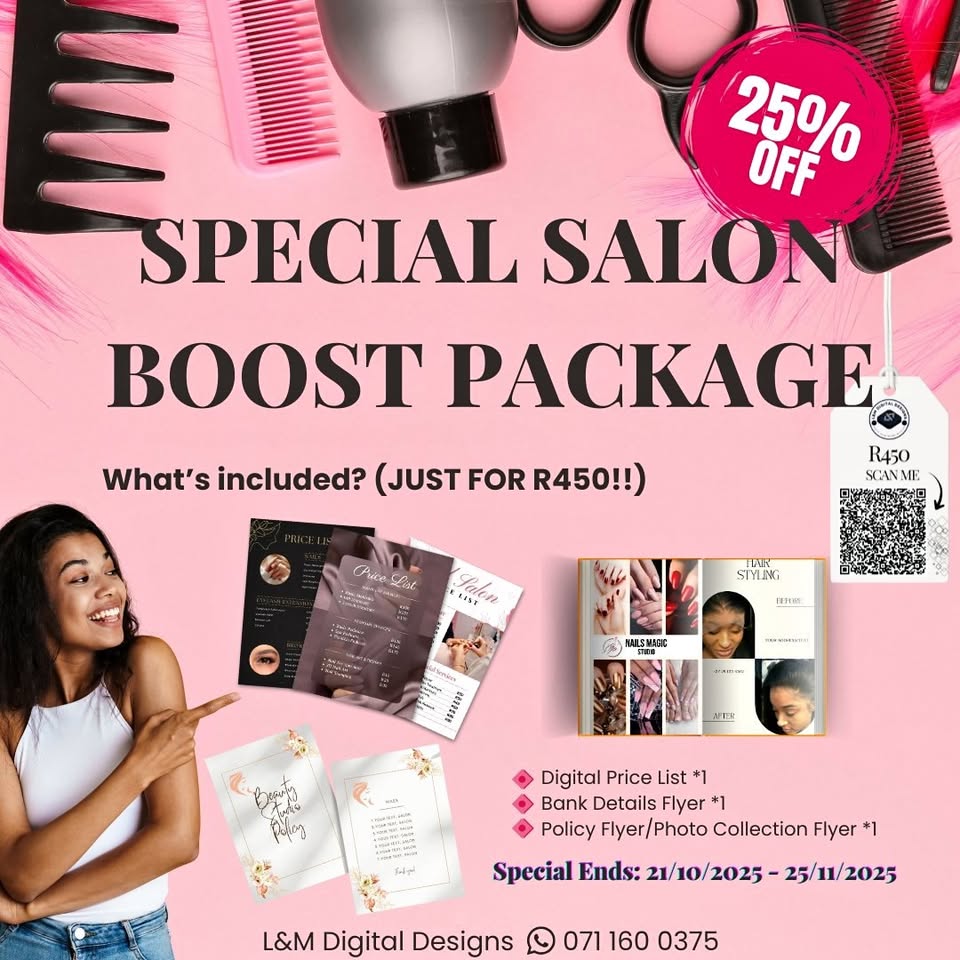 Hey there! 🌸 I’m Lungile from L&M Digital Designs, and we’re helping salon owners get ready for the festive season 🎄✨ Our Special Salon Boost Package includes: 💖 Digital Price List 💖 Digital Bank Details Flyer 💖 Plus your choice of either: • A Salon Policy Flyer or • A Photo Collection Flyer of your best work 📸 Normally, each design costs R200, but this full digital package is 25% OFF for a limited time — only R450! 🎊 Give your salon a fresh, professional look before December clients start booking 💅 Everything is digital, delivered via WhatsApp or email — perfect for quick sharing and printing! 📩 Message me today to grab your festive deal💕