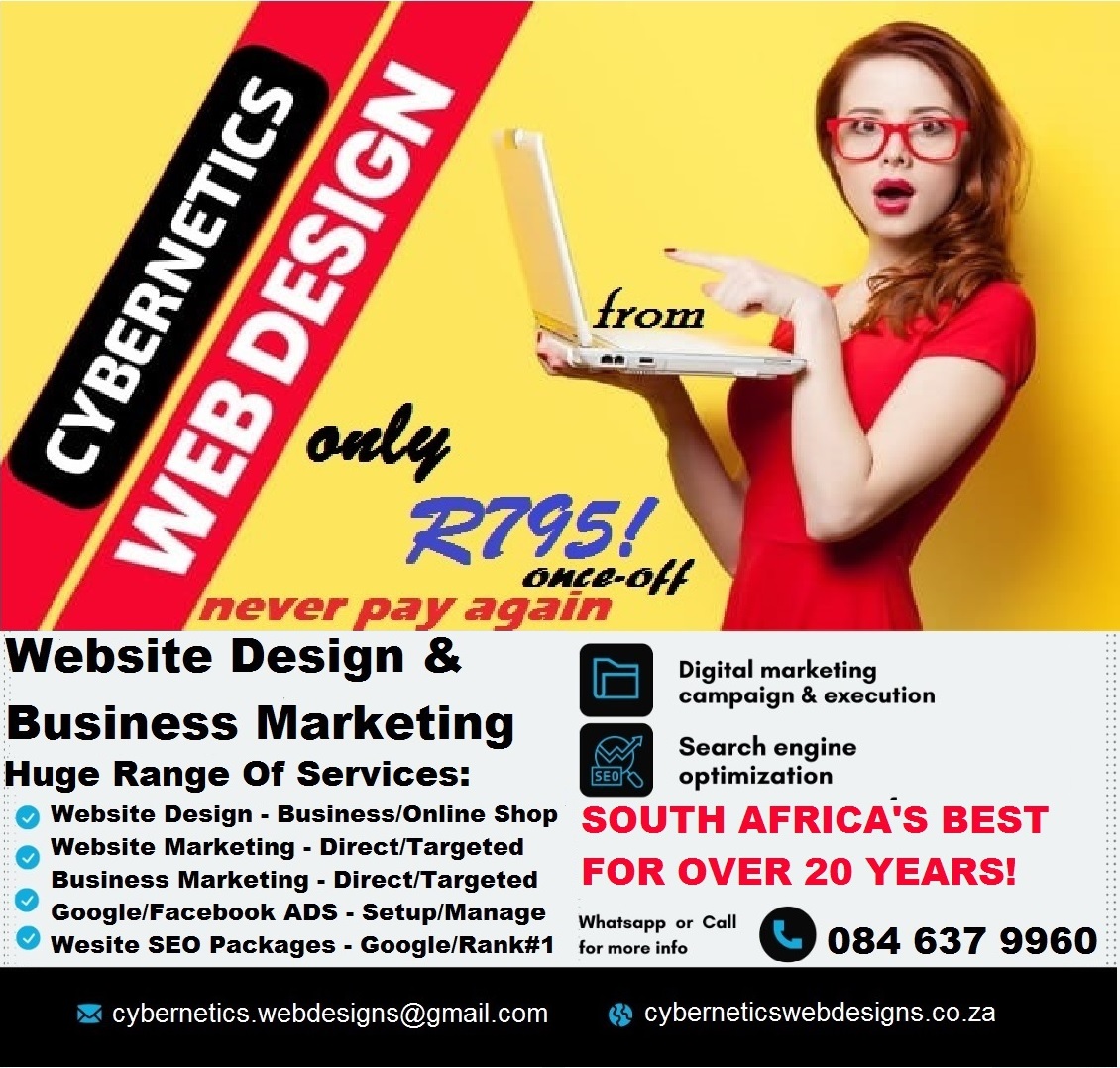 Cybernetics Web Designs ZA* Webdesign & Business Marketing Agency* 1 Page Website R795! Once-Off* 2 - 3 Page Website R2195! Once-Off* 4 - 5 Page Website R2695! Once-Off* 6 - 8 Page Website R3495! Once-Off* 9 - 12 Page Website R4495! Once-Off* Ecomm Online Shop Store From R3995! *Need Clients Today? *Is Your Business Doing Bad?* We Have Various Affordable Business Marketing Packages Available! *Yes We Are Bold With The Next Statement Because We Can, Instant Results Guaranteed!* *Other Services We Provide:* Google Ads PPC/Facebook Ads Manage* Business/Website Marketing* Social Media Account Management* Business Online Footprint Assessment* Google My Business & Directory Setup* Website SEO Packages* Corporate Business Identity* Content Creation Copywriter* Infographic/Business Logo Designs* We Don't Mess Around, Make Your Business Skyrocket With Sales and Exposure!* Various Other services available! Please Visit Our Website Below For More Information, Alternatively Contact/WhatsApp us Directly. 084x637x9960 Website: https://www.cyberneticswebdesigns.co.za/