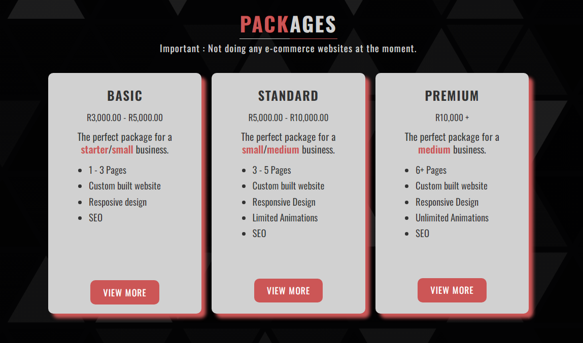 Pricing starts from R3000,00 (Price depends on project scope, see my portfolio for more detailed information)