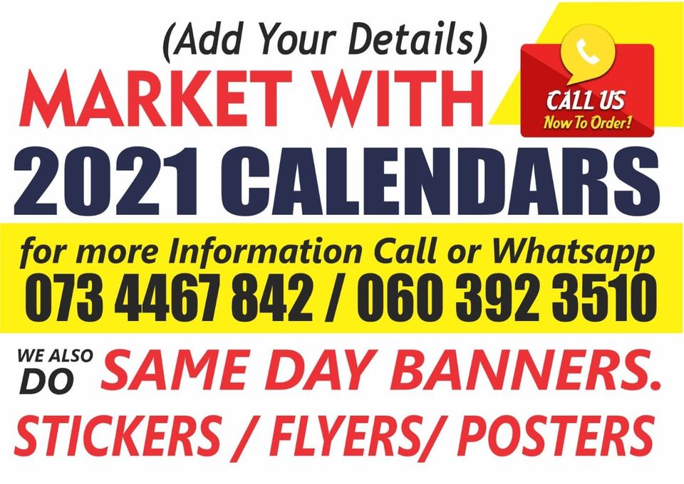 Market your company, product, service, campaign with Calendars. call or whatsapp . Any size. Other promotional items available like branded diaries