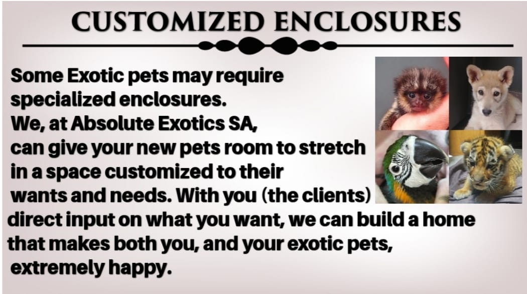 Some Exotic pets may require specialized enclosures. We, at Absolute Exotics SA, can give your new pets room to stretch in a space customized to their wants and needs. With your (the buyers) direct input on what you want, you can build a home that makes both you, and your exotic pets, extremely happy.