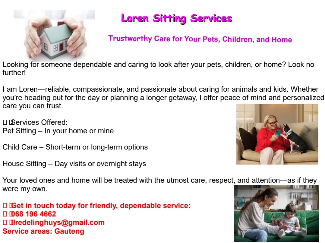 I’m a reliable and compassionate individual with a deep love for animals and children. Whether you need pet sitting, child care, or house sitting services, I’m here to provide peace of mind while you're away—whether it’s for a day out or an extended holiday.