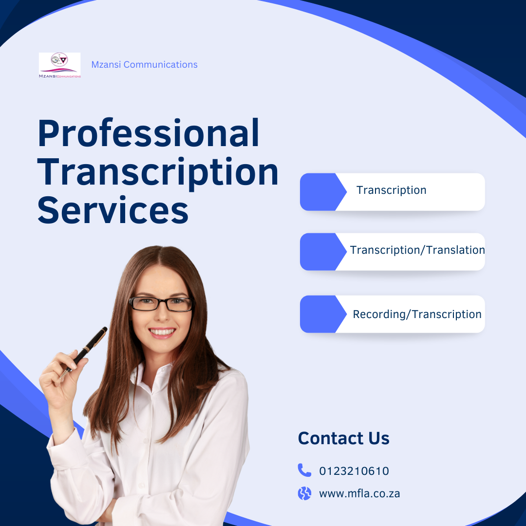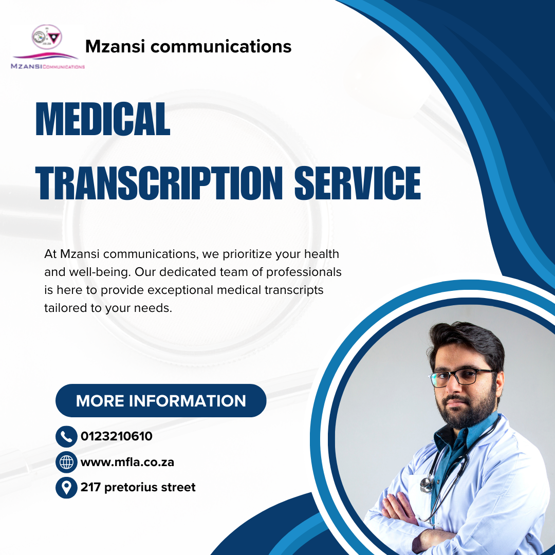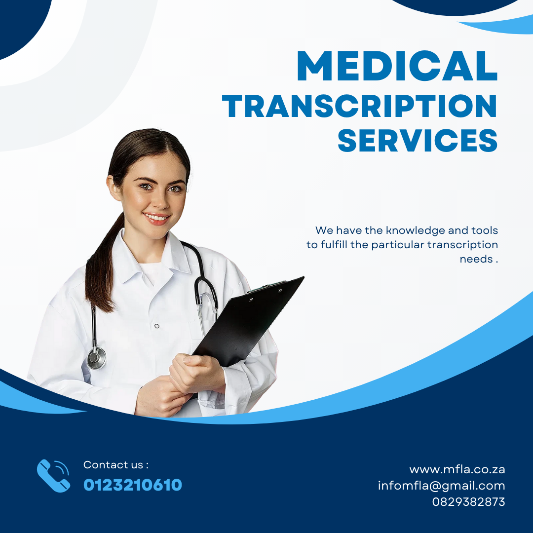 Transform all your audio medical files with us at affordable rates, whether they are legal, medical, or any other type. Additionally, we offer translation services for the transcribed text in a language of your choice. Contact us via: Website: https://www.mfla.co.za/transcription-services-southafrica/ Email: infomfla@gmail.comview email... Phone: