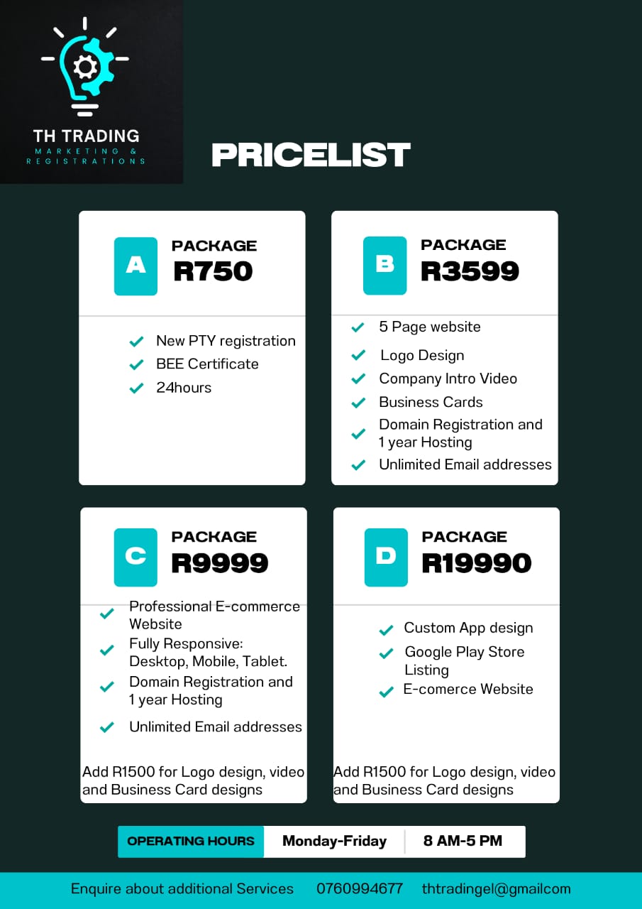 Lets get your business moving and making money by choosing one of the following packages that's suits you starting from R750-R1990.00