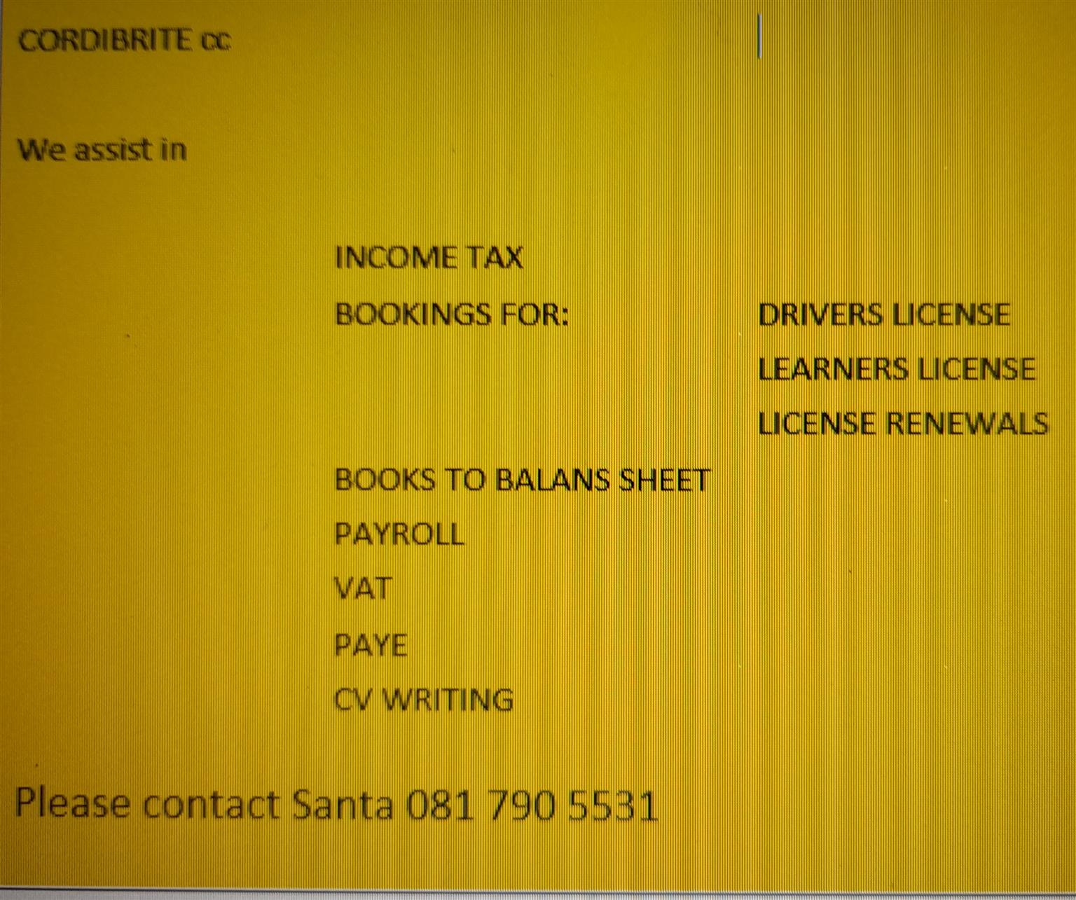 Bookings on license needs. PRDP . Bookkeeping and payroll. CV writing