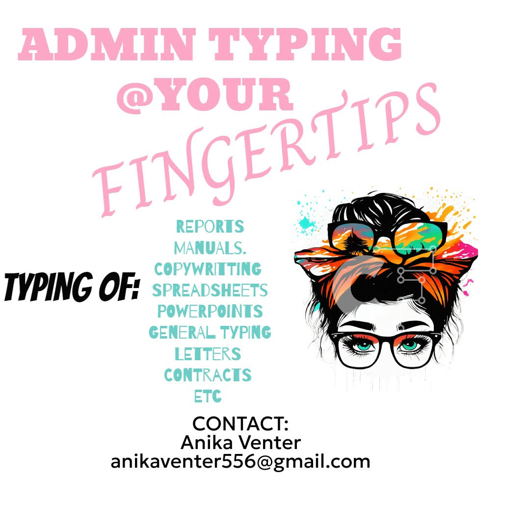 at anikaventer556@gmail.comview email... today for all your typing needs. We are based in Gauteng but if you can email your needs we can help you.