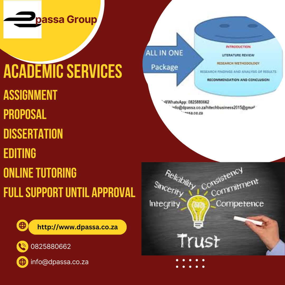 A team of Research experts is available to assist you with all your research and academic needs. Our team comprise of experts from various academic fields including business, education, marketing, social sciences, IT, human sciences and more. We assist students of all levels; from diploma, bachelors, honors, masters, to PhD. All students from Universities in South Africa are welcome, We can start with you from scratch. Confidentiality is our number 1 priority.