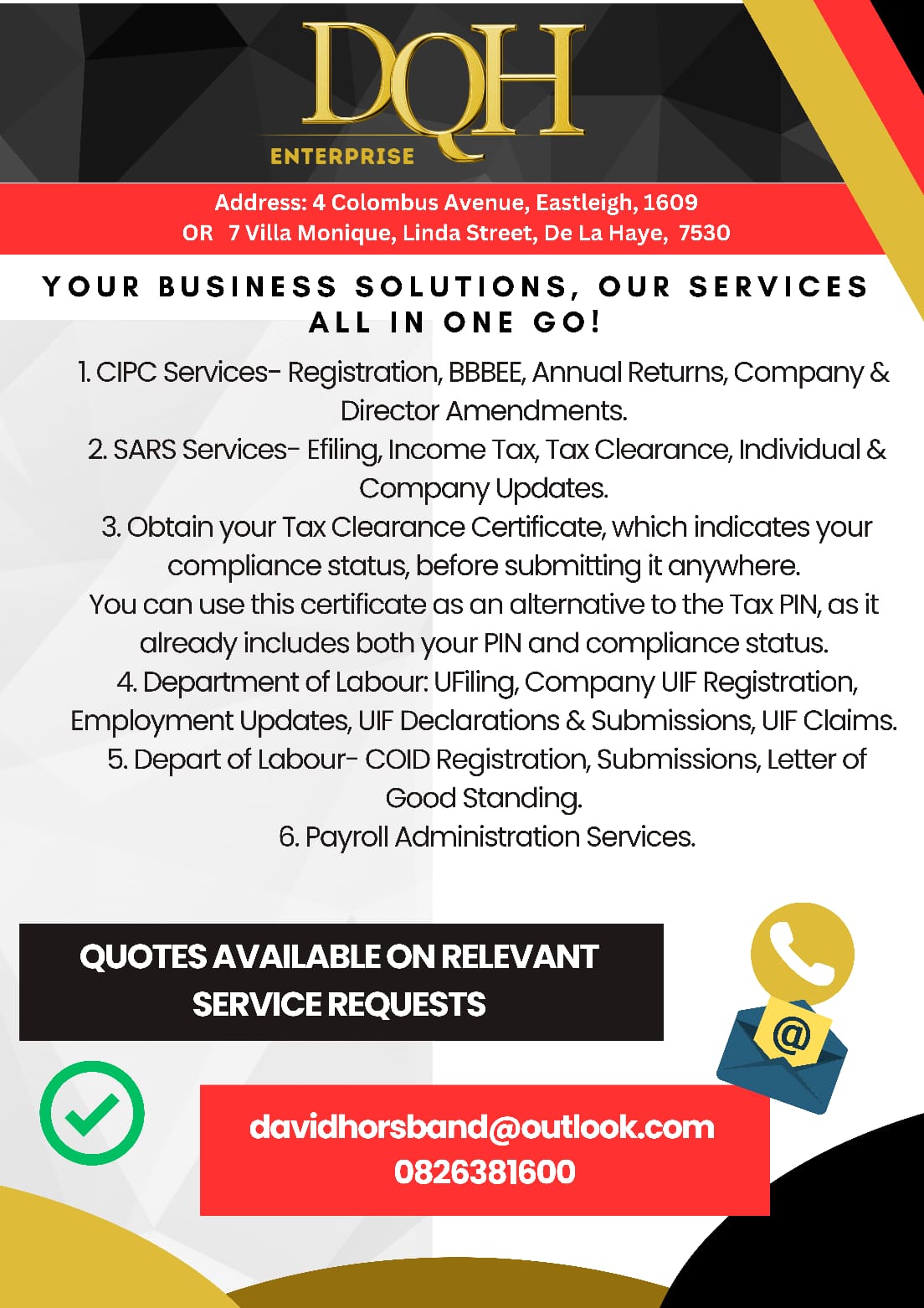 1. CIPC Services- Registration, BBBEE, Annual Returns, Company & Director Amend. More details: