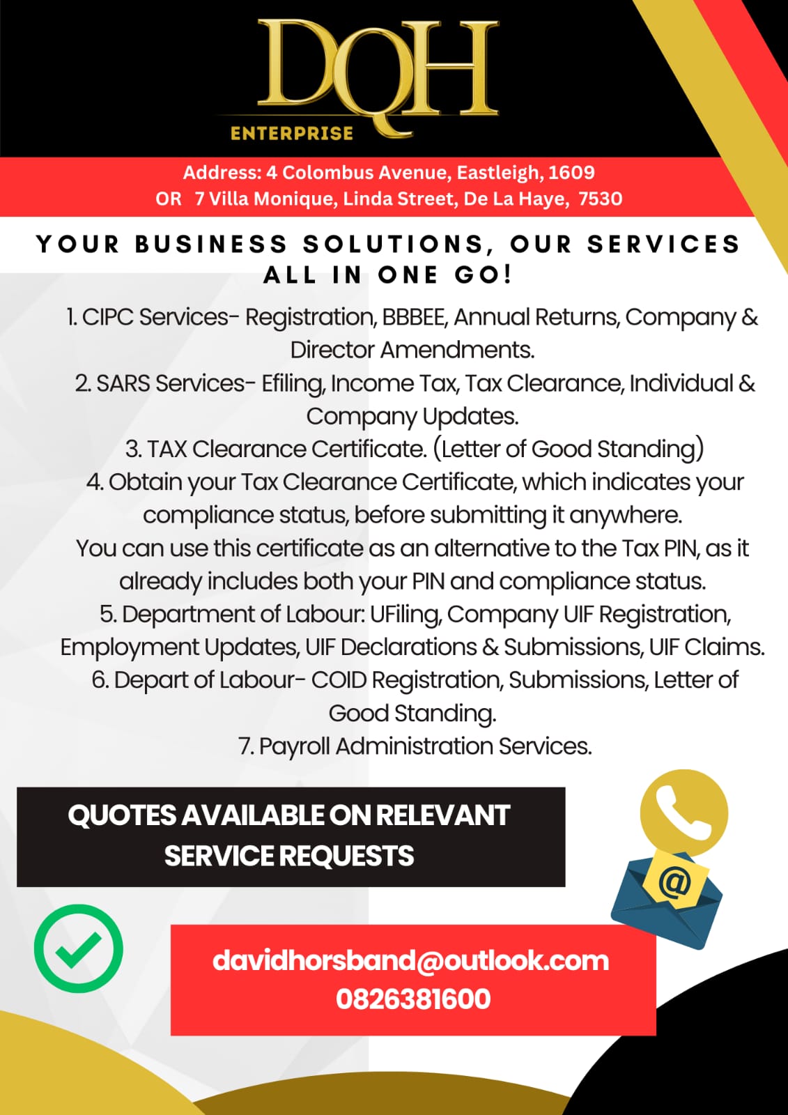 1. CIPC Services- Registration, BBBEE, Annual Returns, Company & Director Amend. More details: