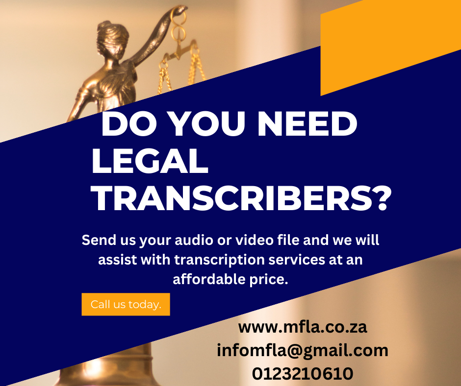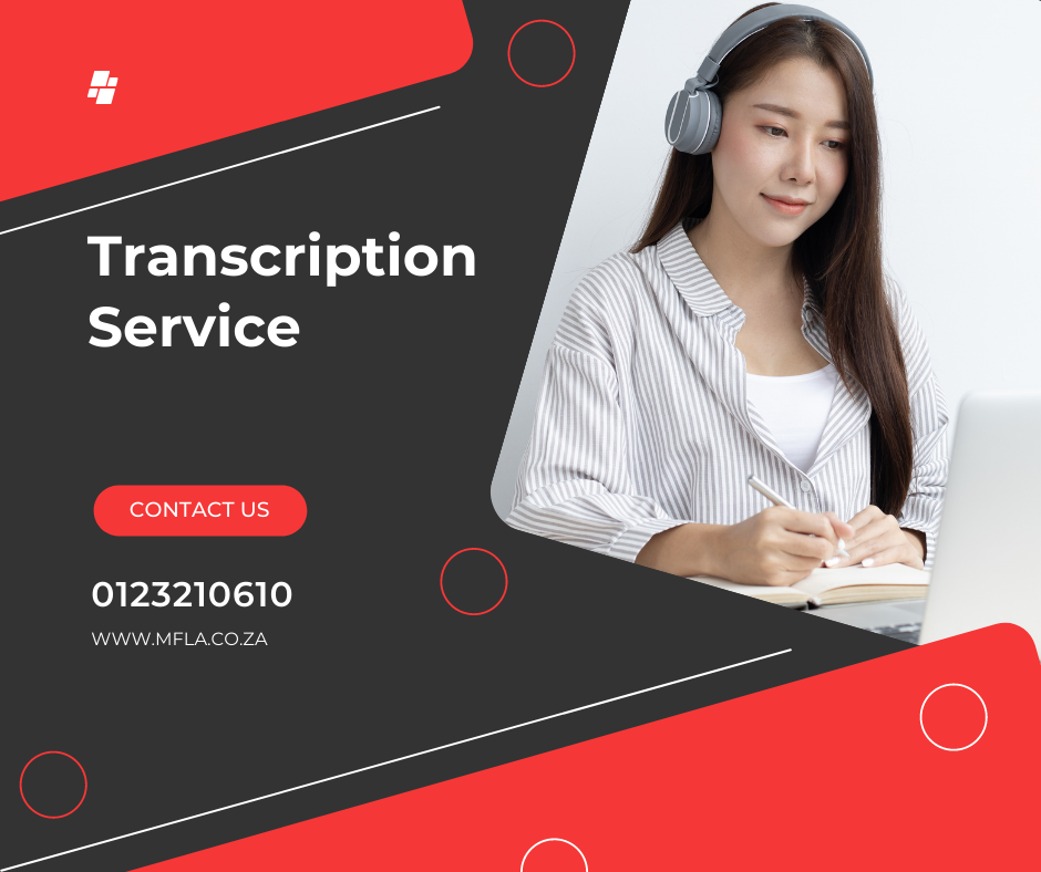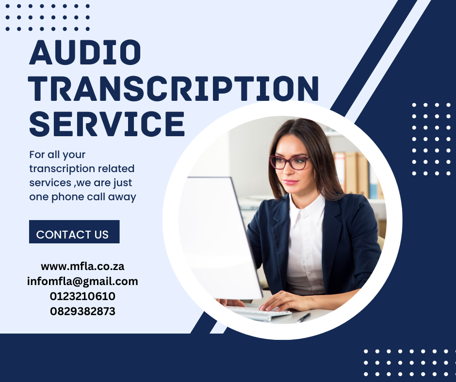 Contact us via: Website: https://www.mfla.co.za/transcription-translation-services/ Email: infomfla@gmail.comview email... Phone: 012-321-0610view more