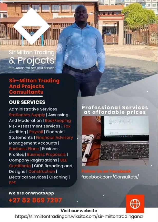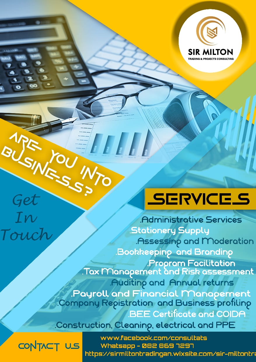 Administrative Services | Stationary Supply | *Assessing And Moderation* |Bookkeeping |Risk Assessment services | Tax | *Auditing* | Payroll | Financial Statements | Financial Advisory | Accounts Management | *Business Plans | Business Profiles | Business Proposals | Company Registrations* | BEE Certificate| COIDA | Branding | Annual Returns | Construction | Electrical Services|Cleaning|PPE https://www.facebook.com/Consultats/ https://sirmiltontradingan.wixsite.com/sir-miltontradingand