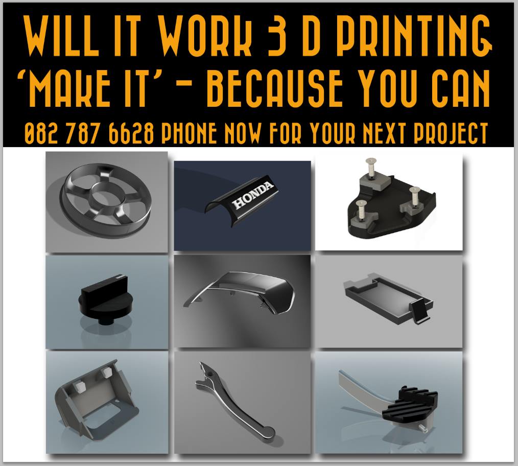 3D printing services for you brackets, some rubber components such as gaskets, grommets, clips, cup holders, missing car parts, phone holders etc etc.